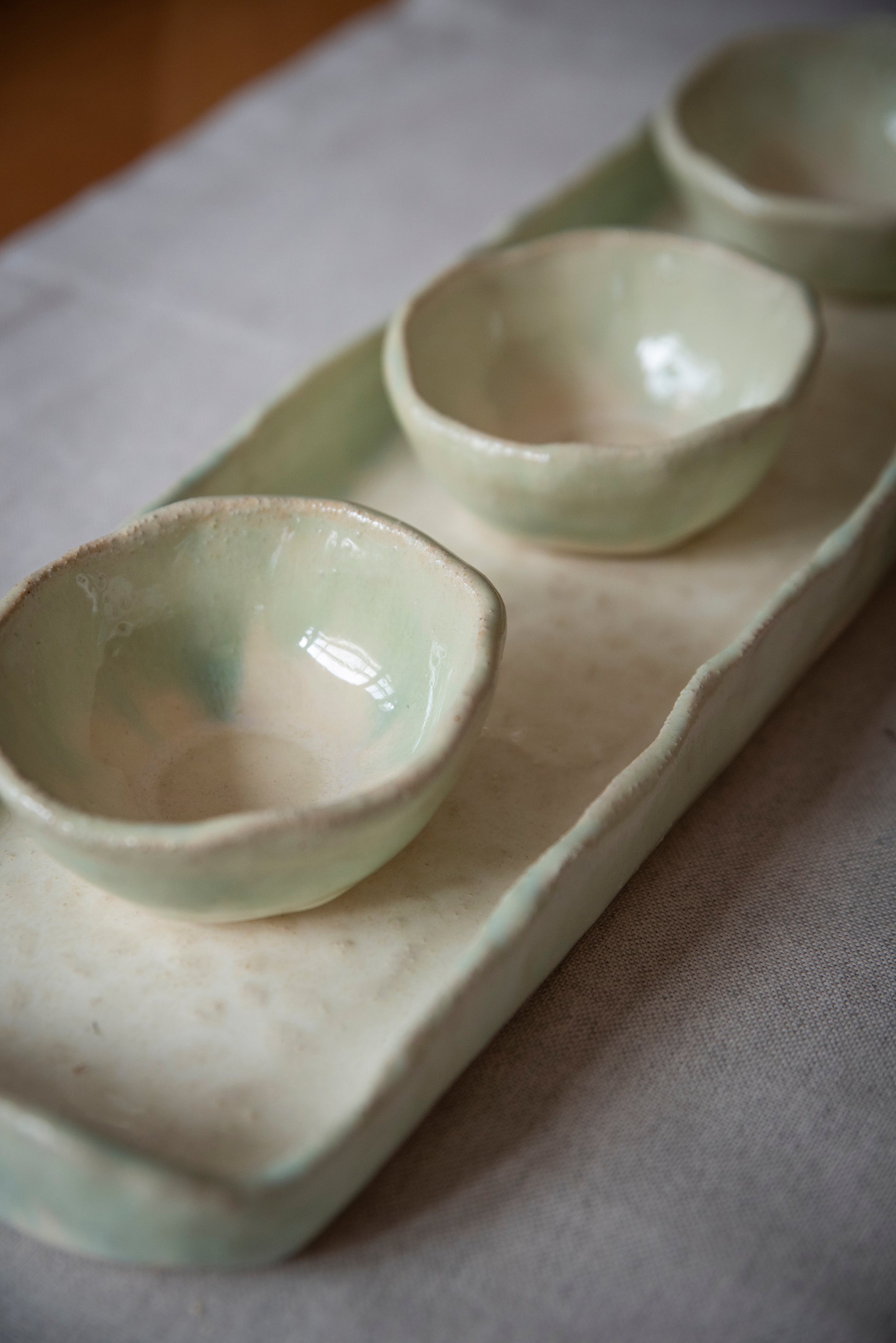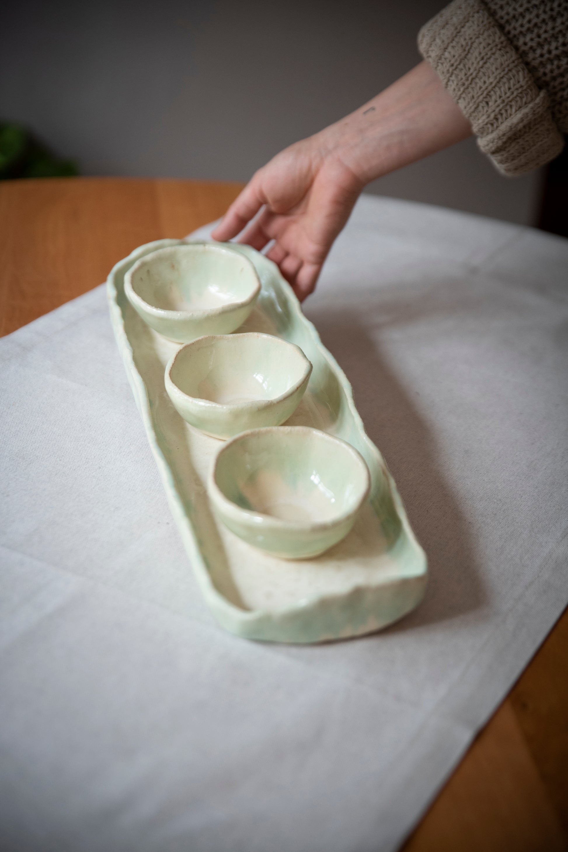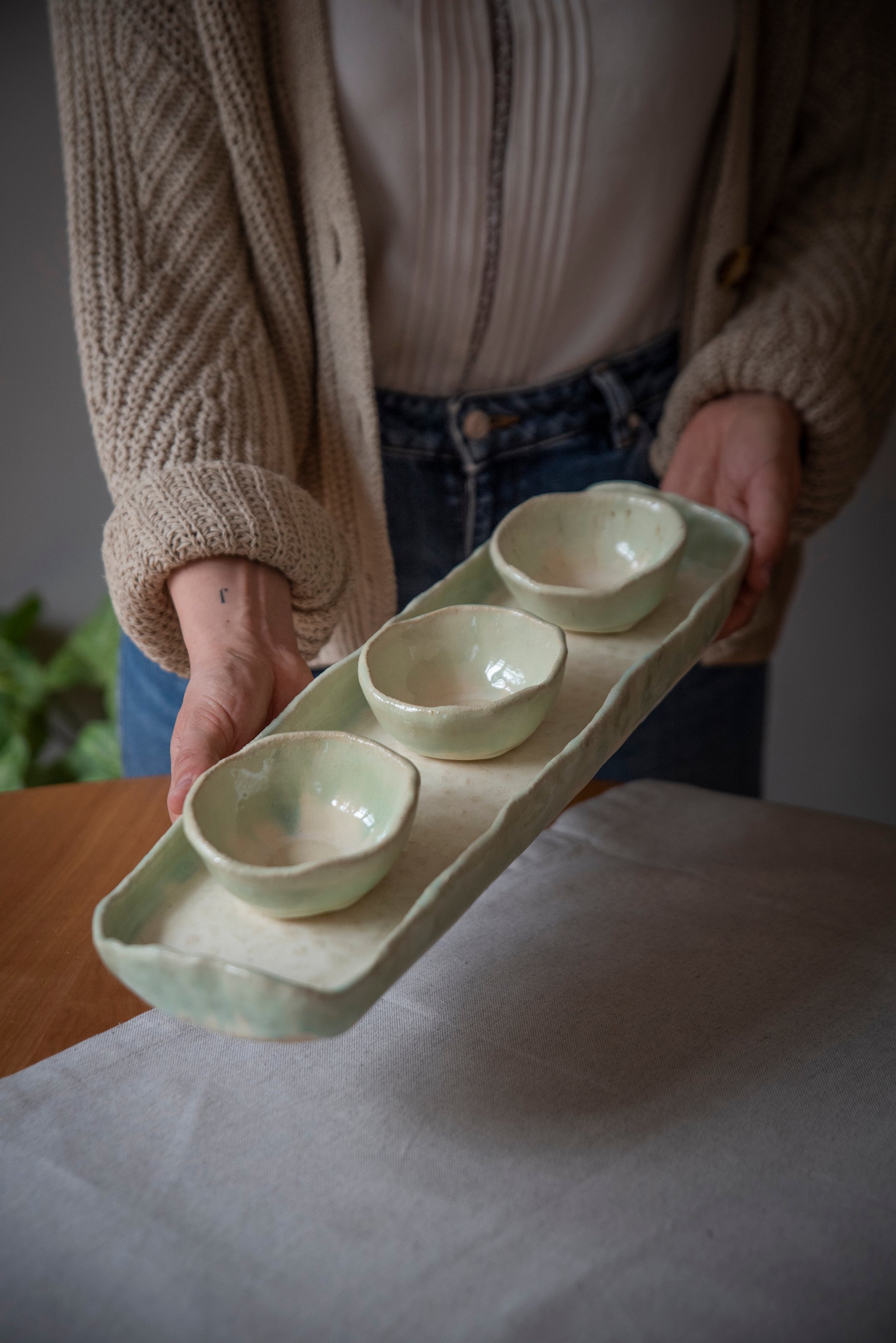 Tabla con 3 pocillos blanco y verde.
