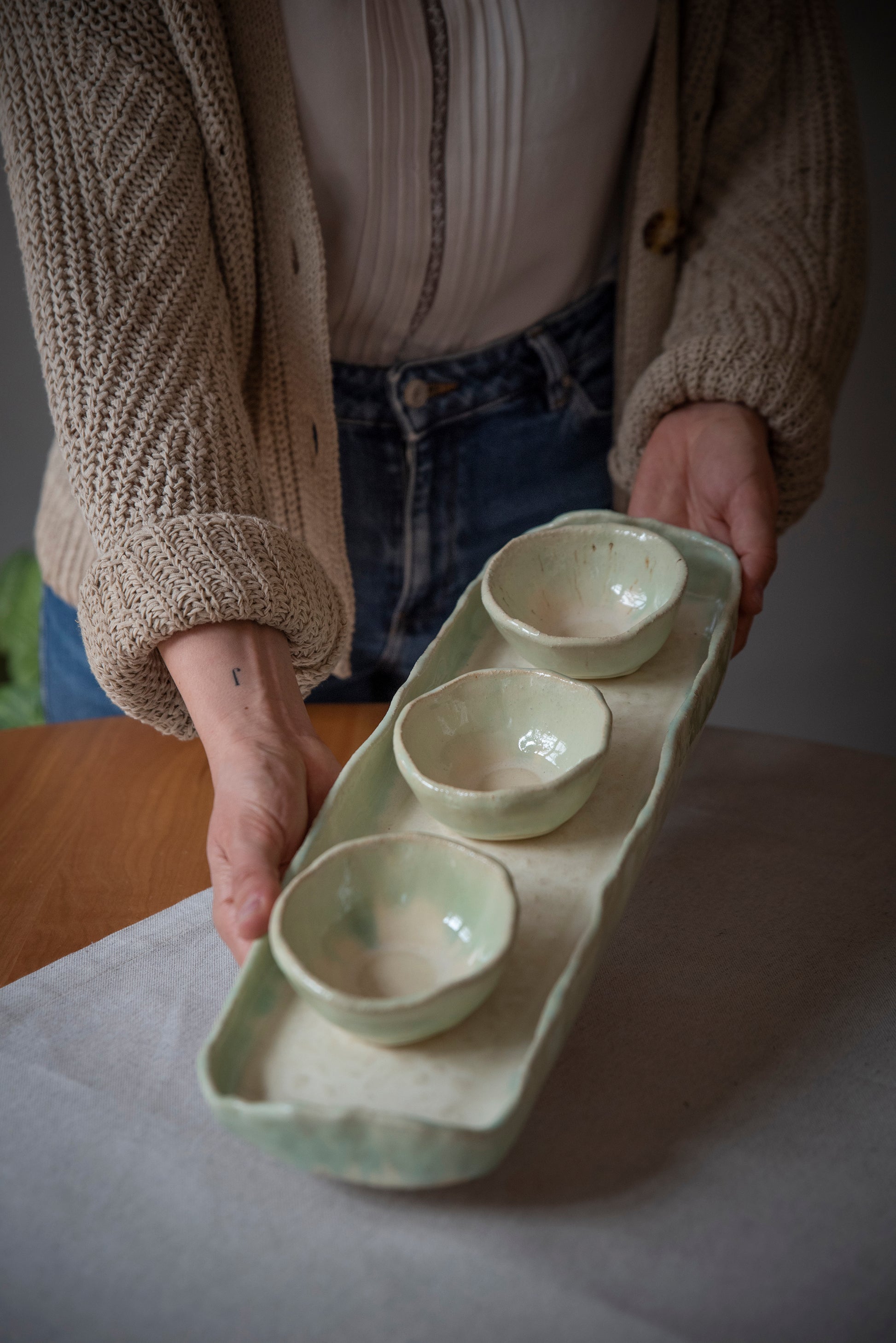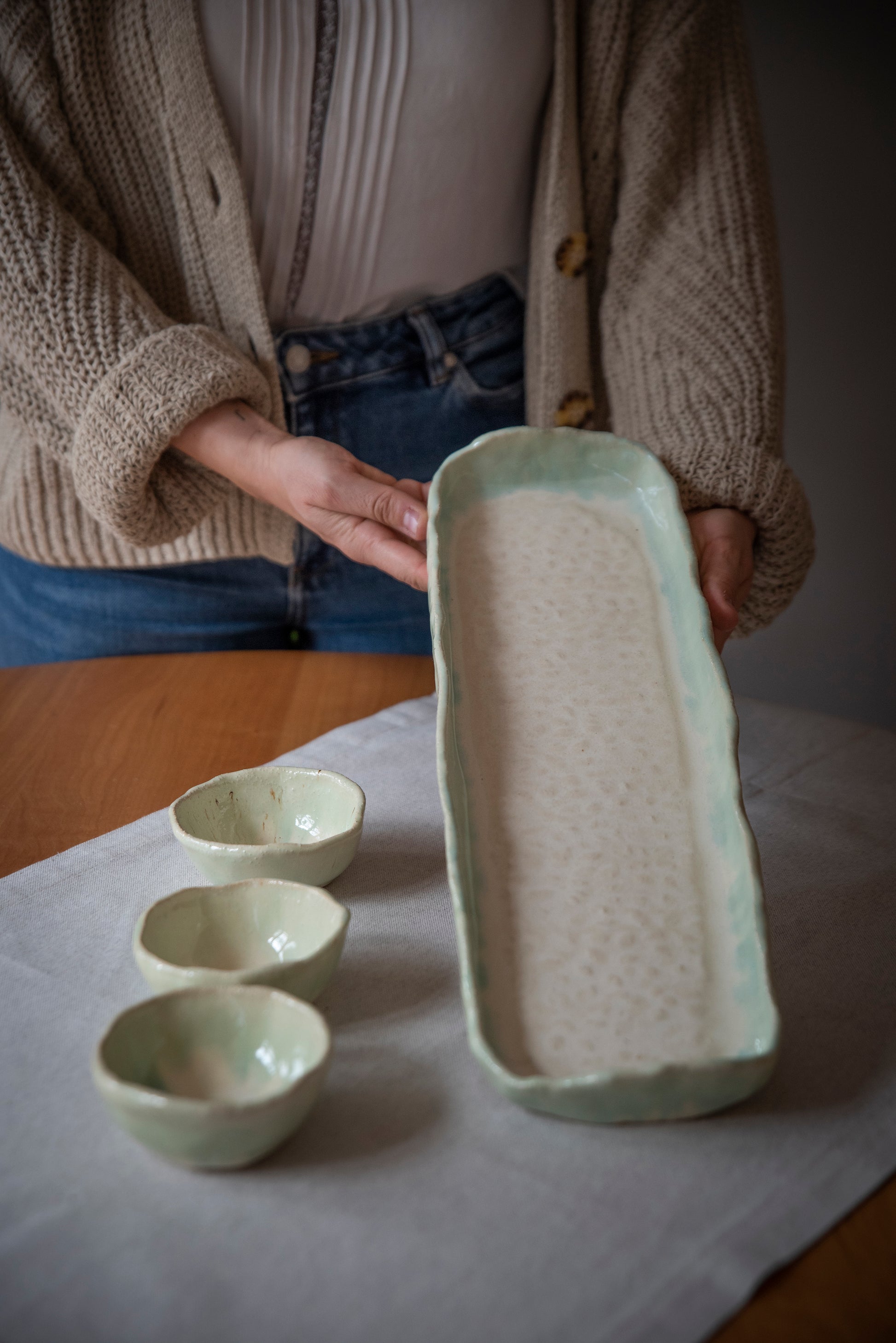 Cerámica de gres 100% hecha a mano, en un proceso artesanal en el que cada pieza es cuidadosamente modelada y elaborada por la artista. Cada pieza posee acabados distintos lo que le da la cualidad de ser única.