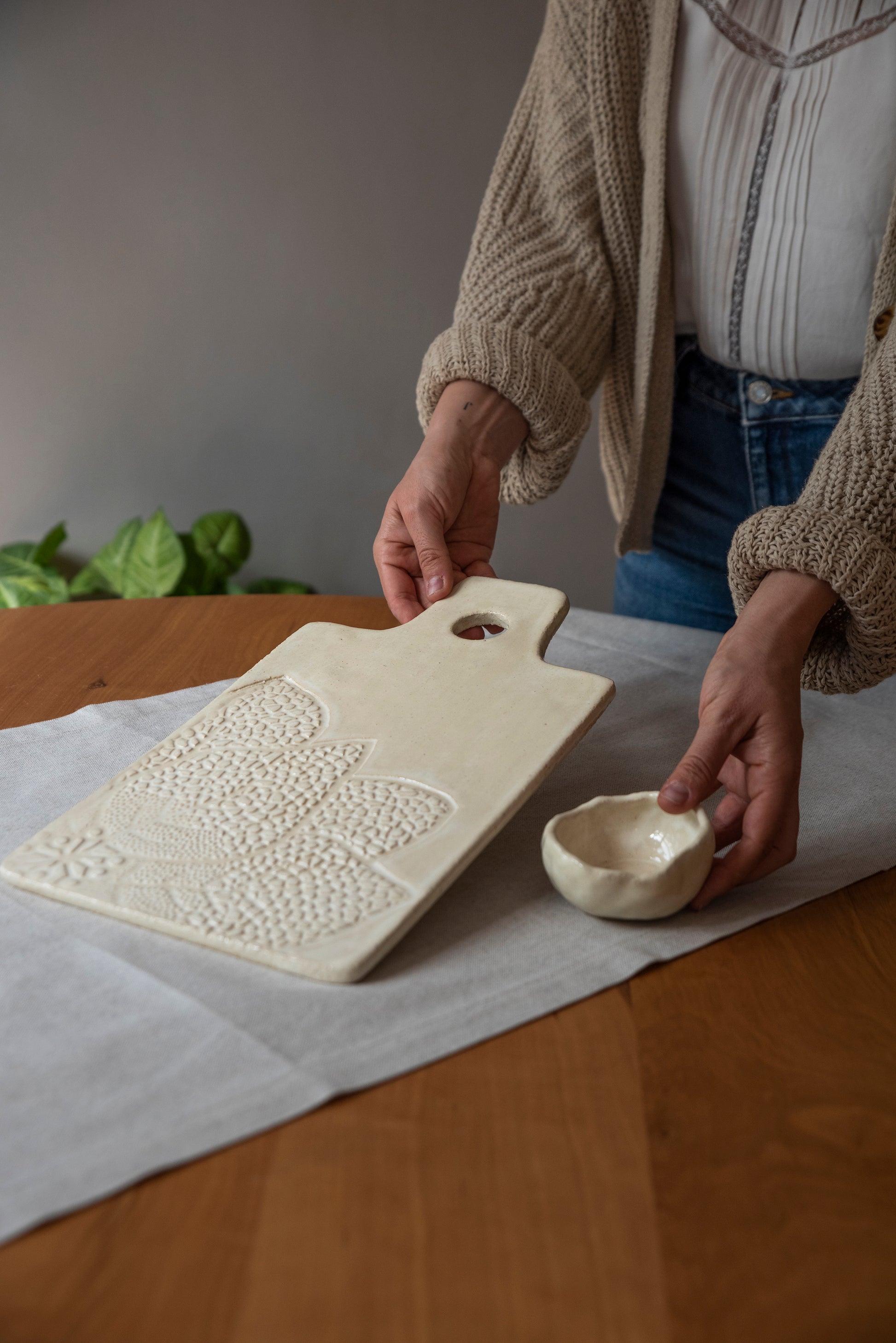 Cerámica de gres 100% hecha a mano, en un proceso artesanal en el que cada pieza es cuidadosamente modelada y elaborada por la artista. Cada pieza posee acabados distintos lo que le da la cualidad de ser única.