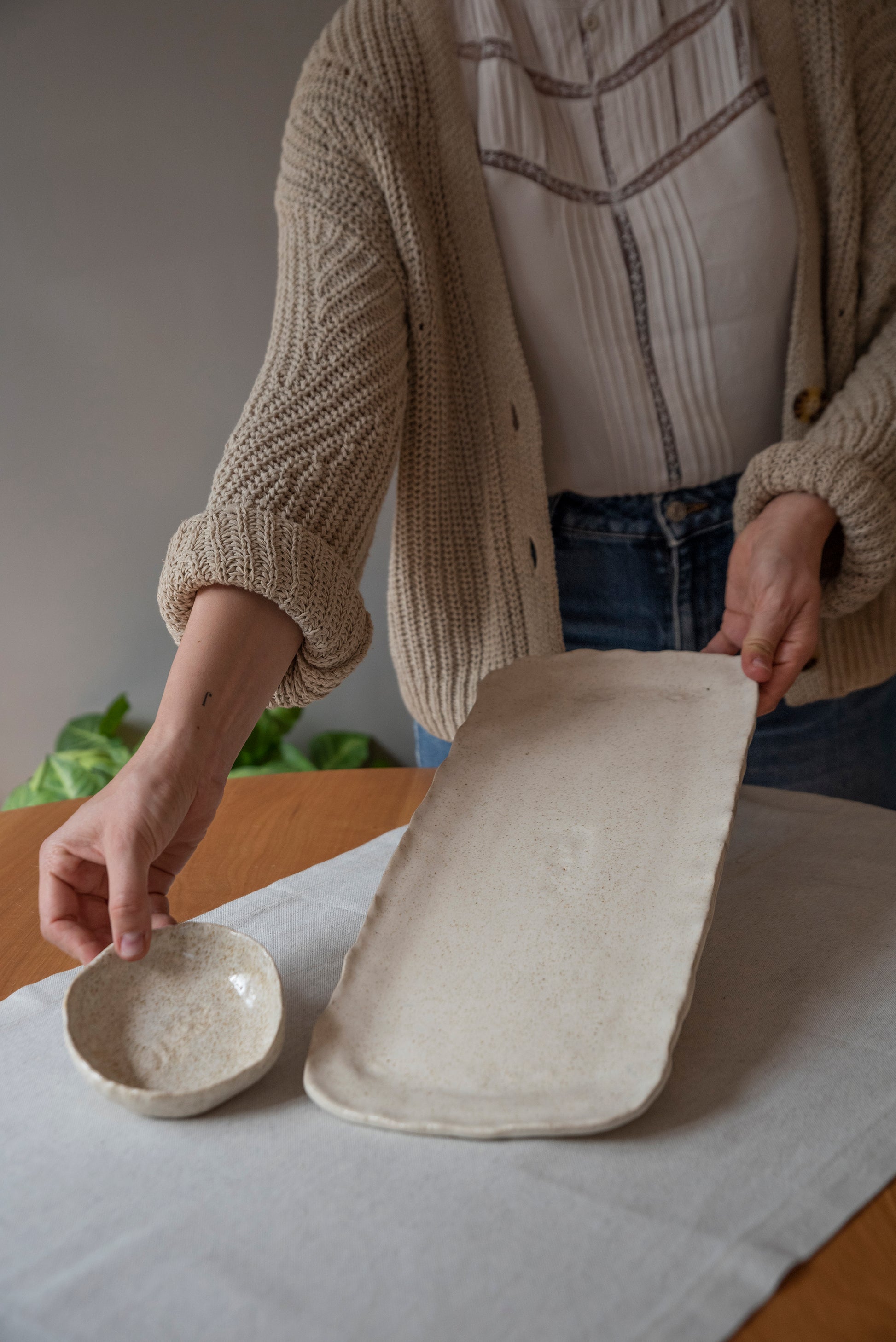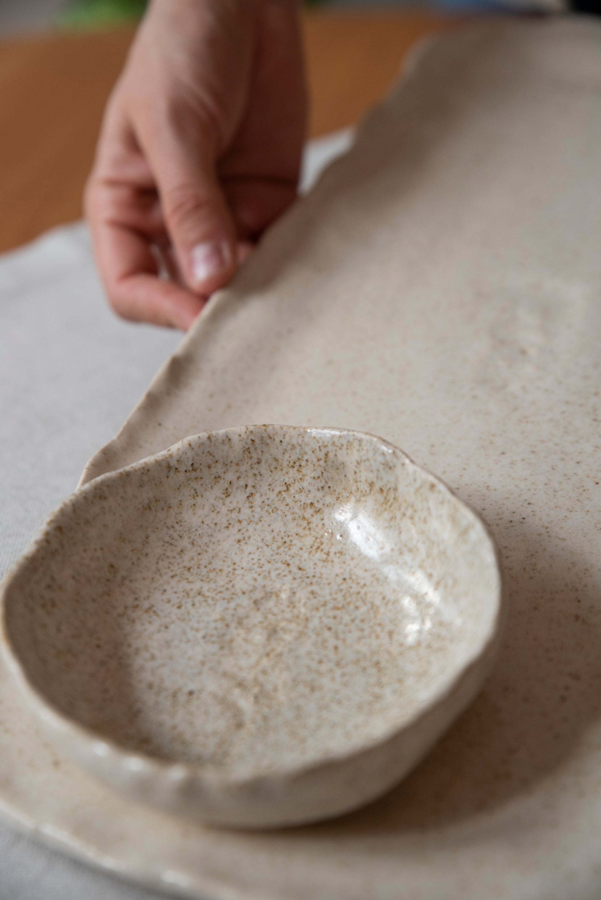 Cerámica de gres 100% hecha a mano, en un proceso artesanal en el que cada pieza es cuidadosamente modelada y elaborada por la artista. Cada pieza posee acabados distintos lo que le da la cualidad de ser única.