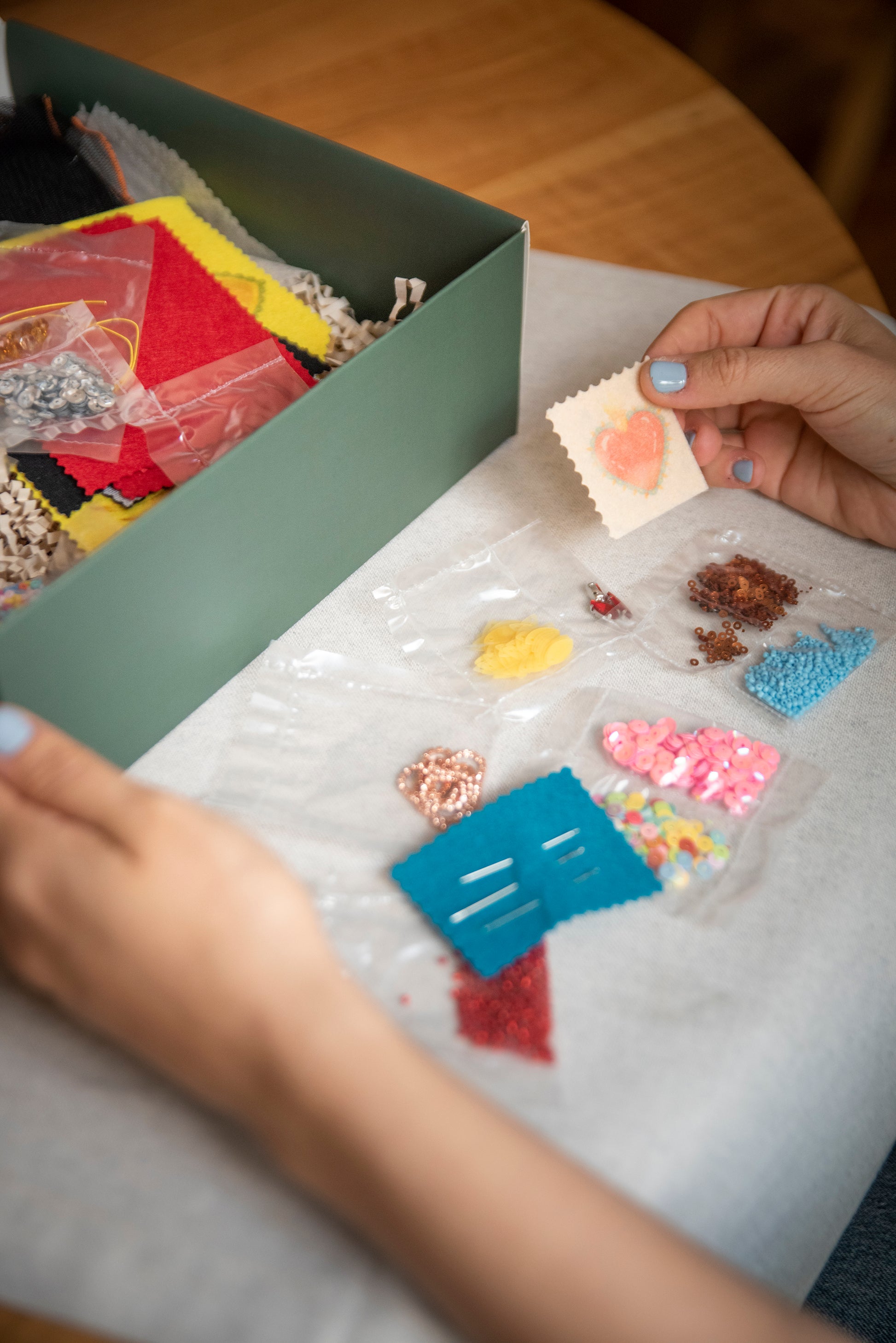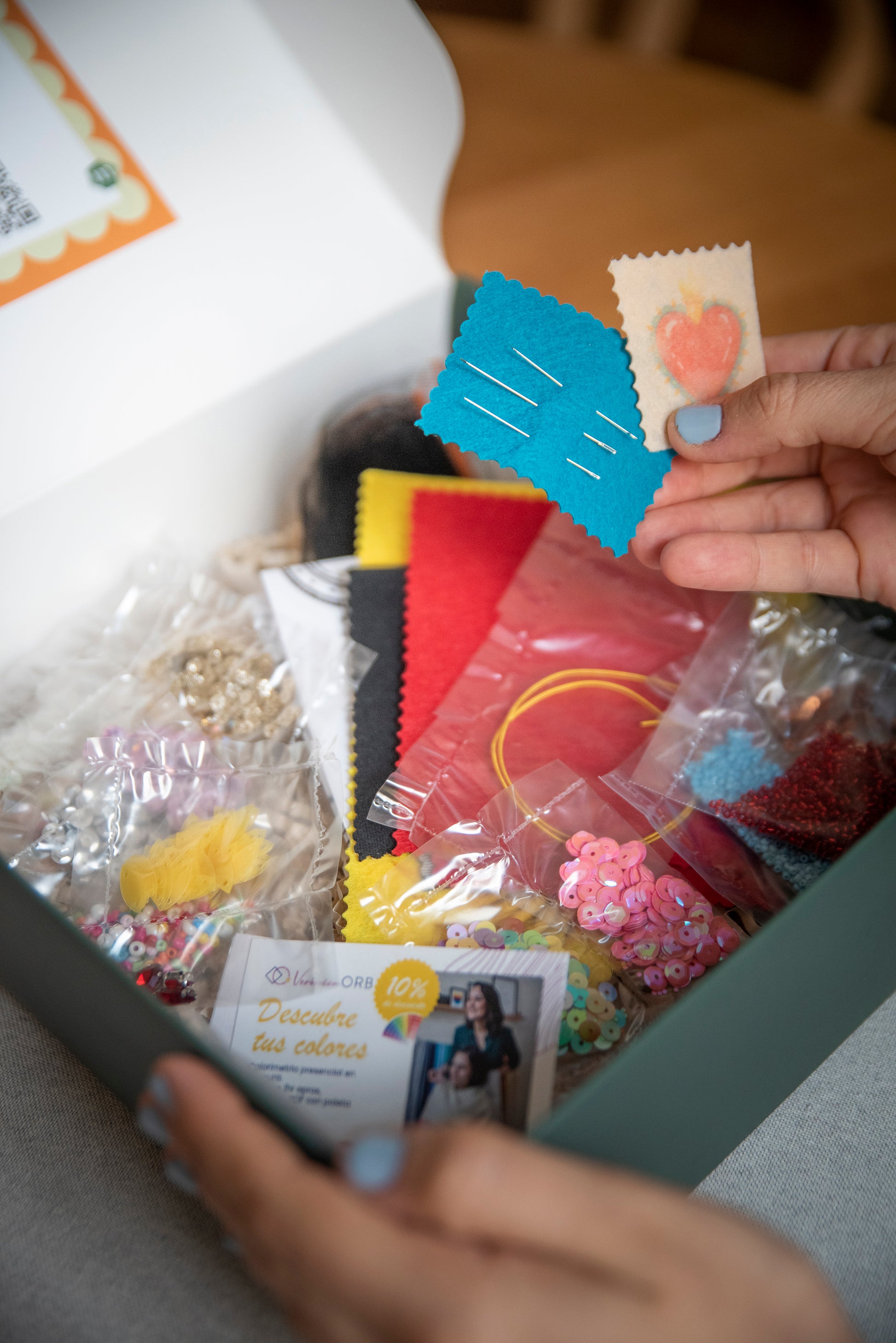Taller de bordado con técnicas de alta costura para crear varios prendedores de corazón alado o parche personalizado, usando lentejuelas, mostacillas, strass, cristales y telas. Incluye productos relacionados a la experiencia.