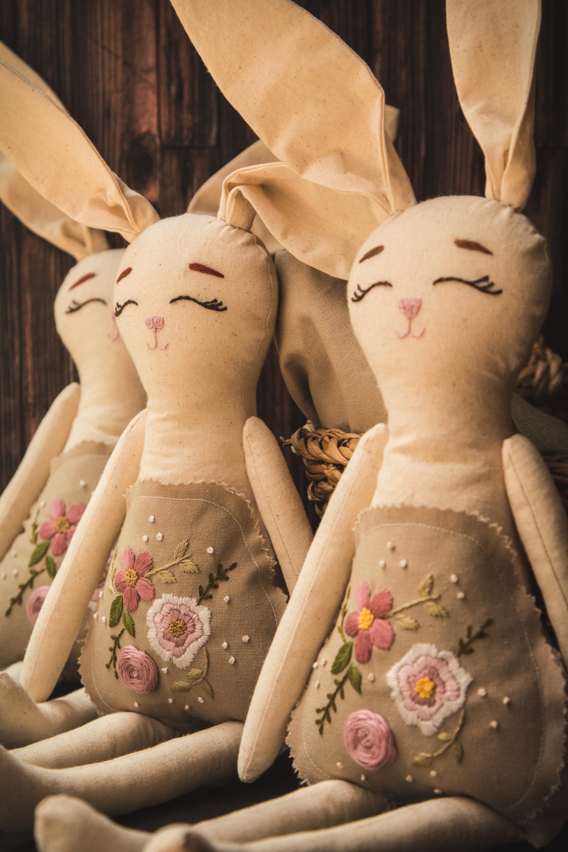 Muñeca de algodón rústico con flores bordadas con hilo de algodón y confeccionada a mano.