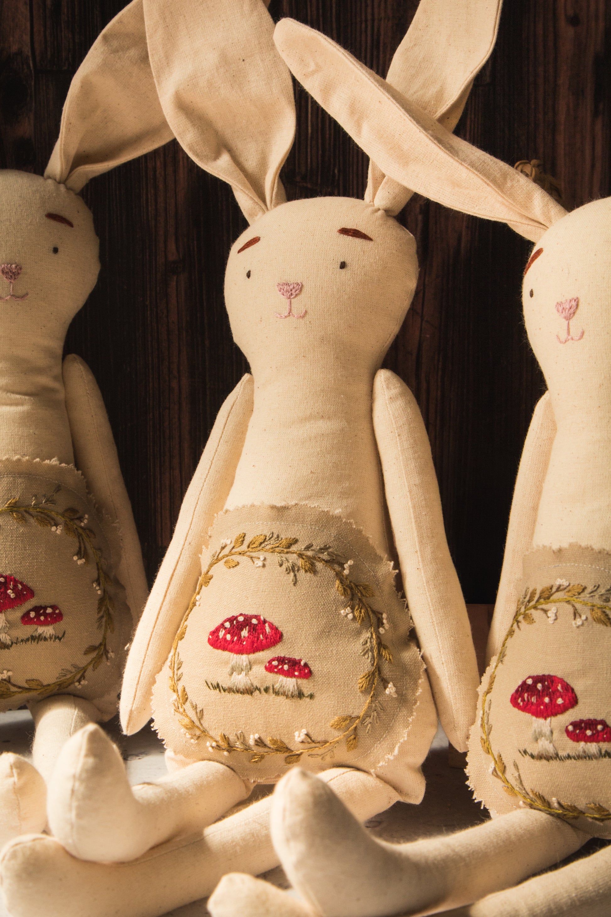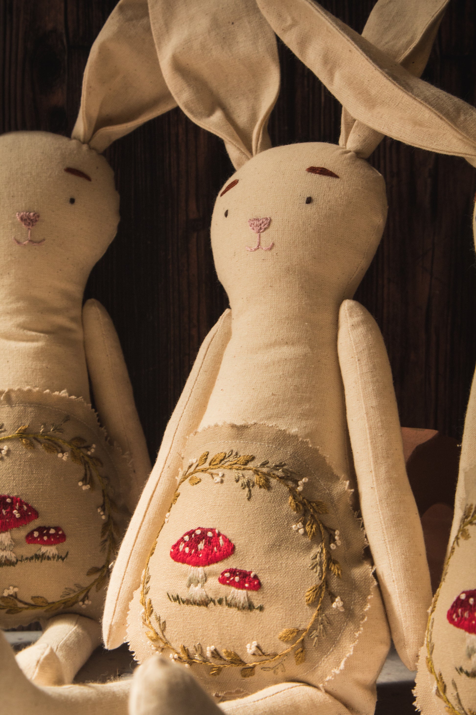 Conejito de algodón rústico con hongo bordado con hilo de algodón y confeccionada a mano.