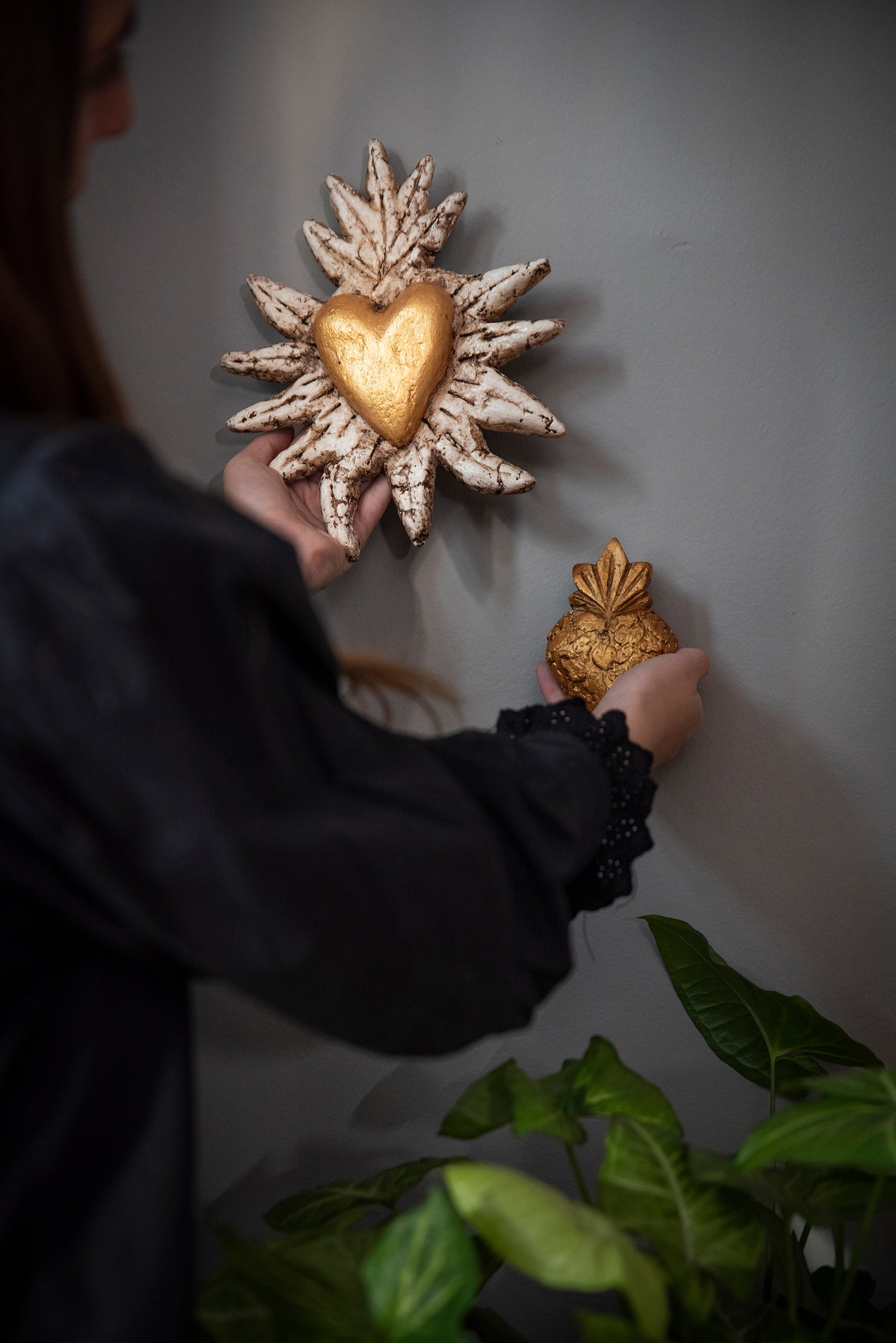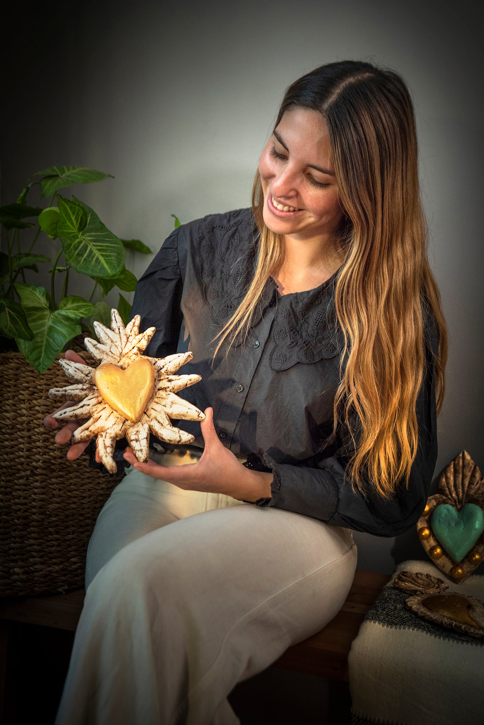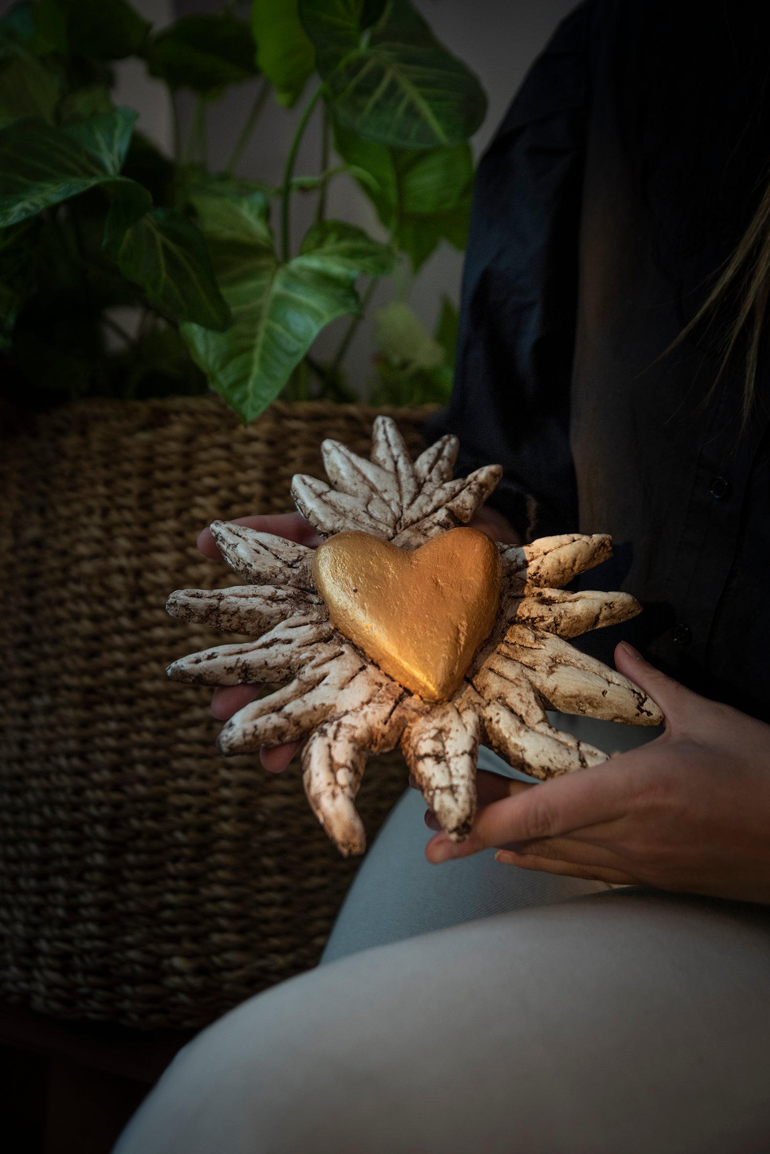 Iluminá tus espacios con este corazón radiante hecho a mano en papel maché. Su forma de sol y su corazón dorado en el centro simbolizan la energía, el amor y la protección. Una pieza artesanal con alma, ideal para dar vida a tus paredes o regalar con profundo significado.