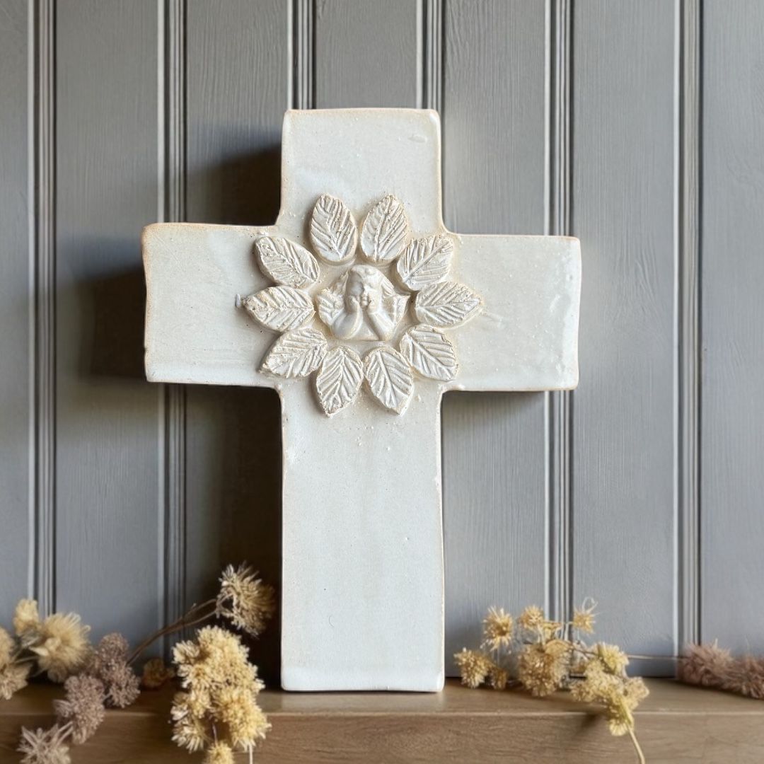 Cruz de 20 cm de cerámica gres color blanco mantequilla