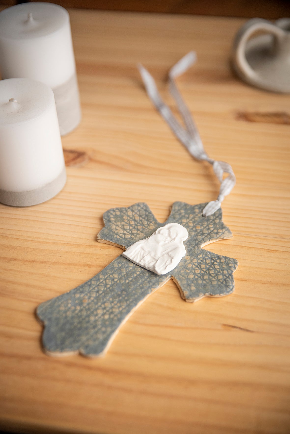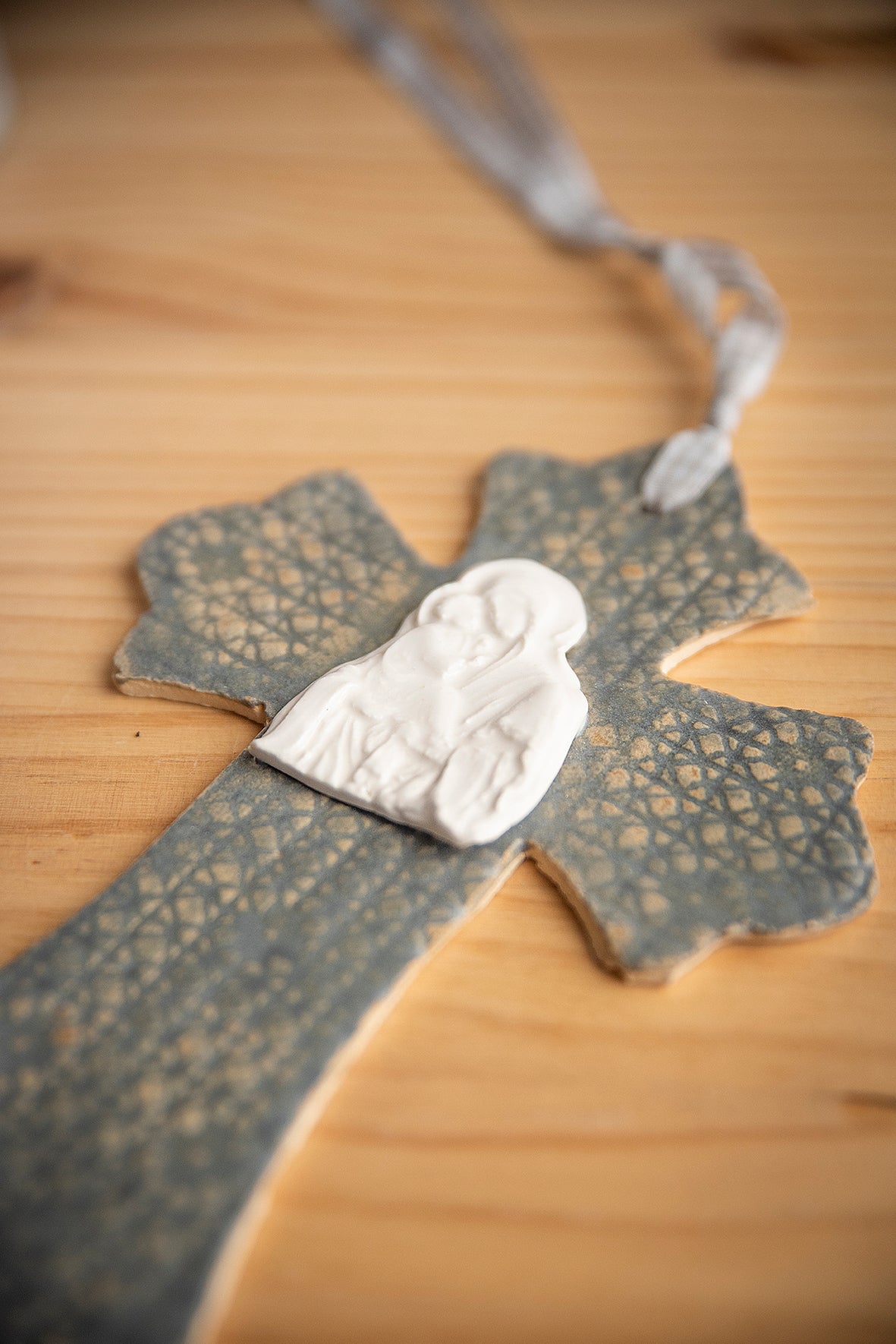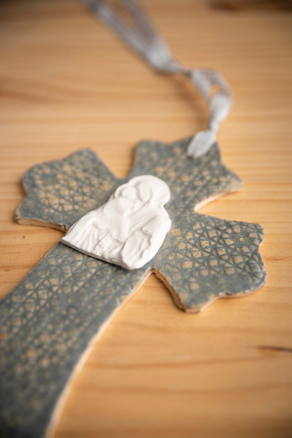 Cruz de cerámica gres con virgen de porcelana.