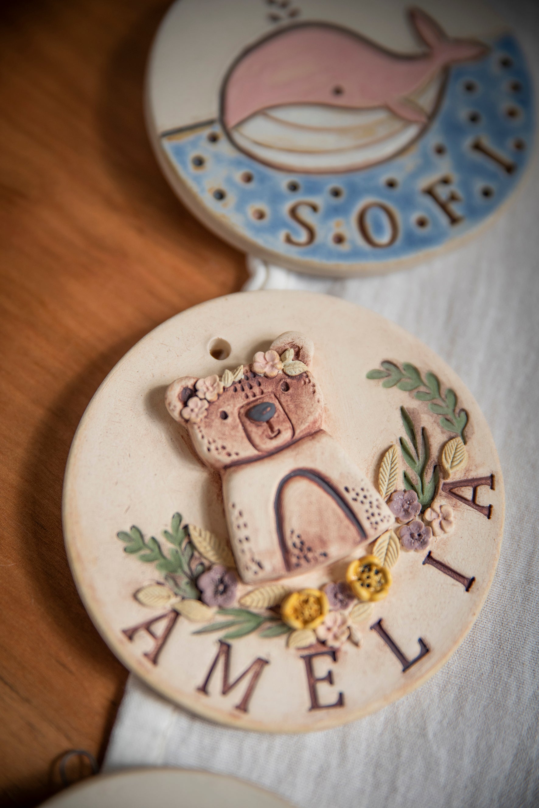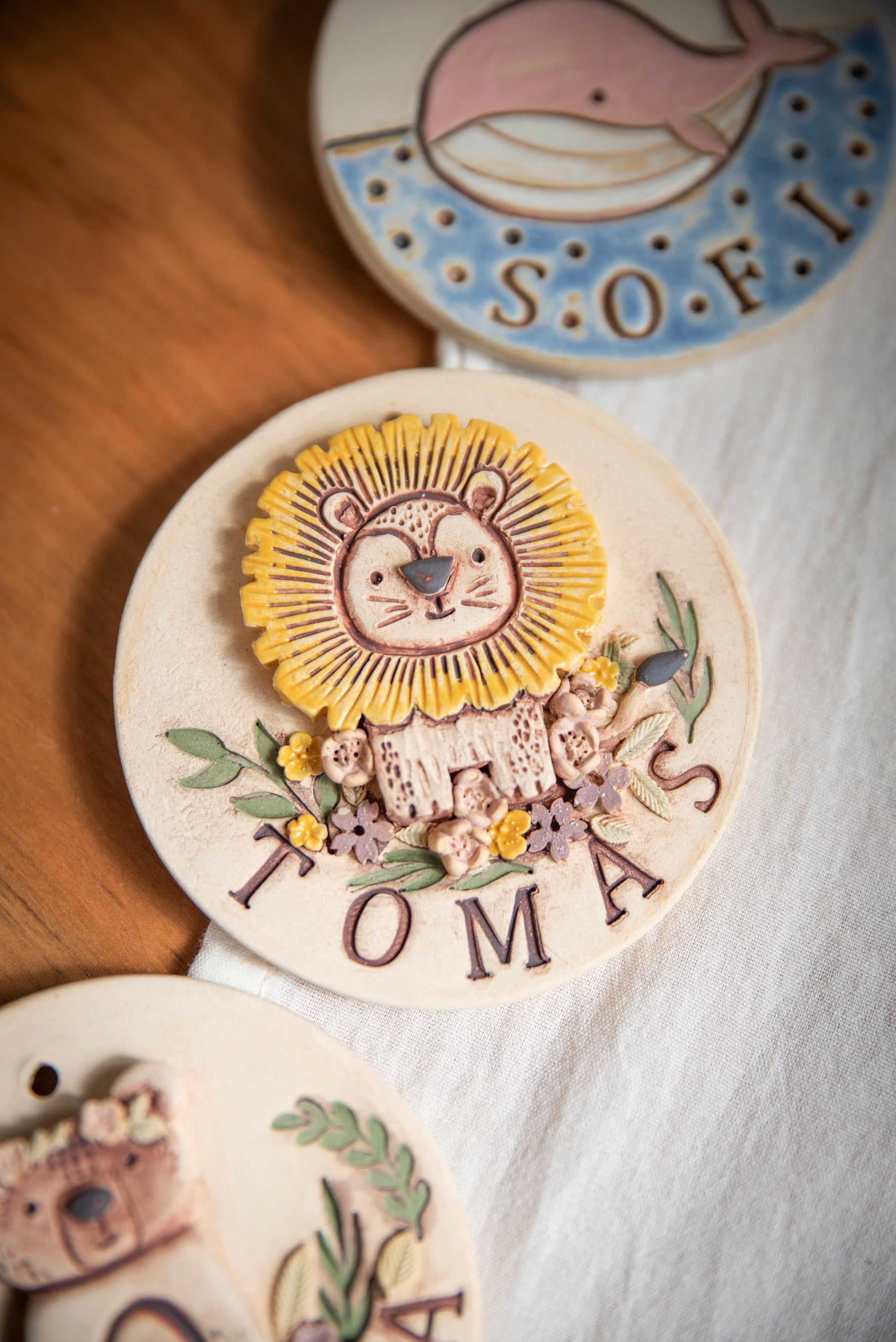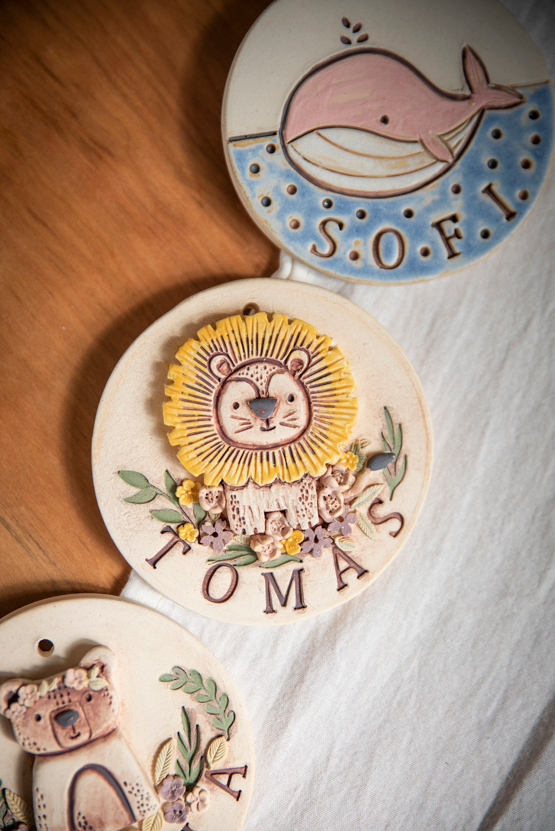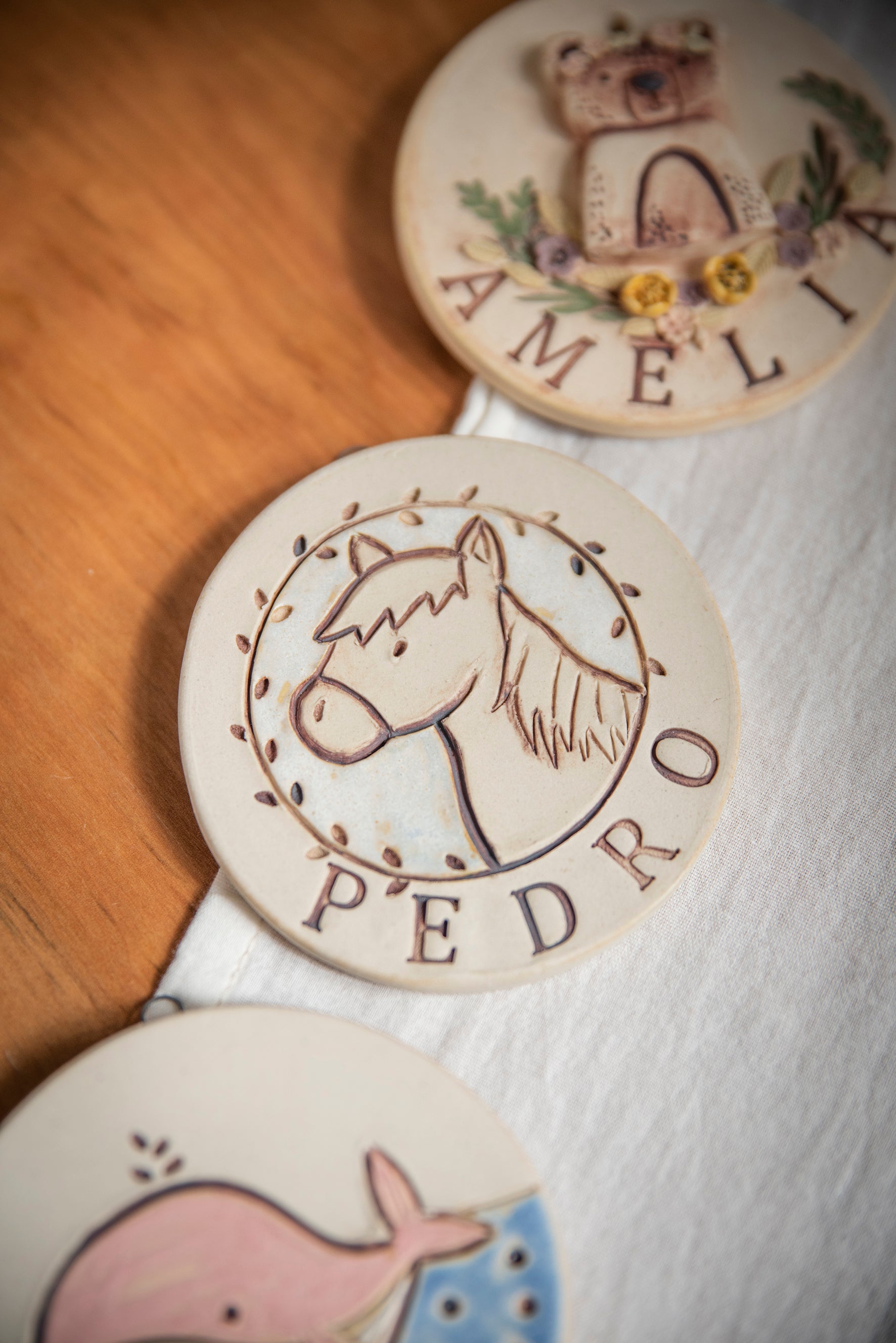 Cuneros con nombre y animales. Hechas en cerámica gres.