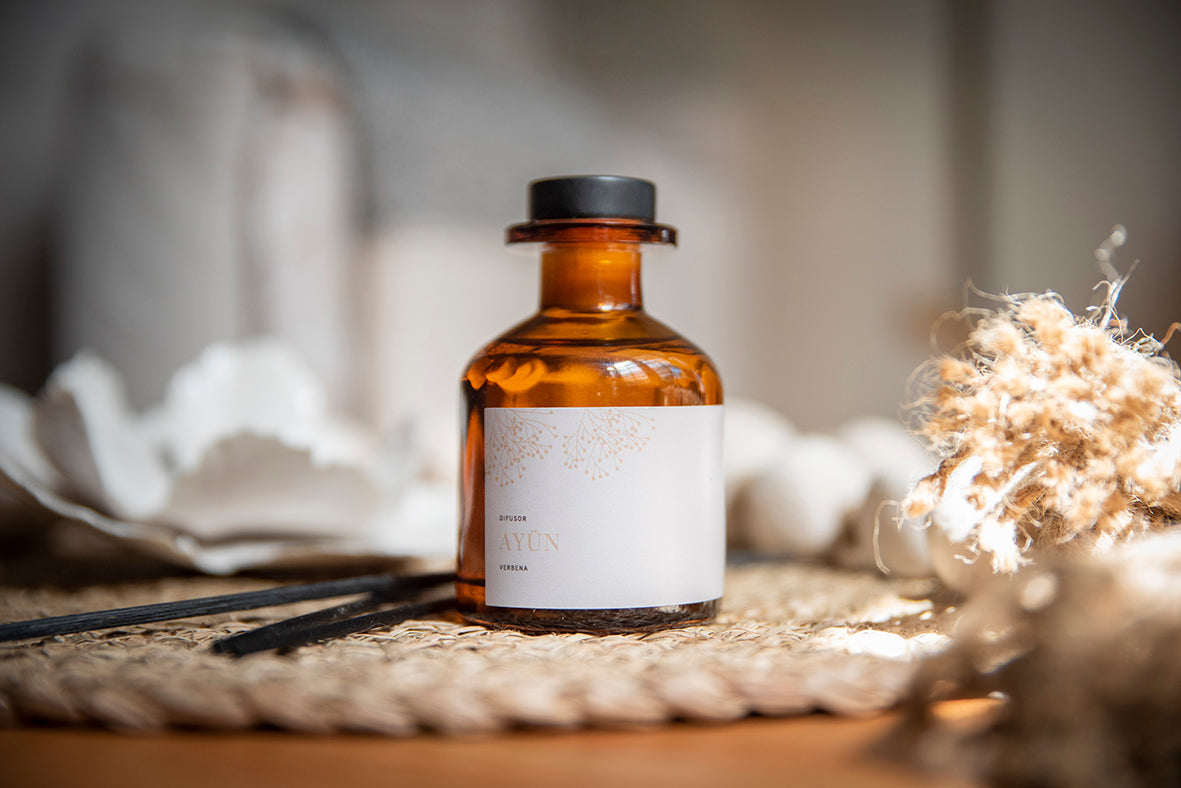 En una botella de vidrio ambar, con 5 varillas de madera negra.
