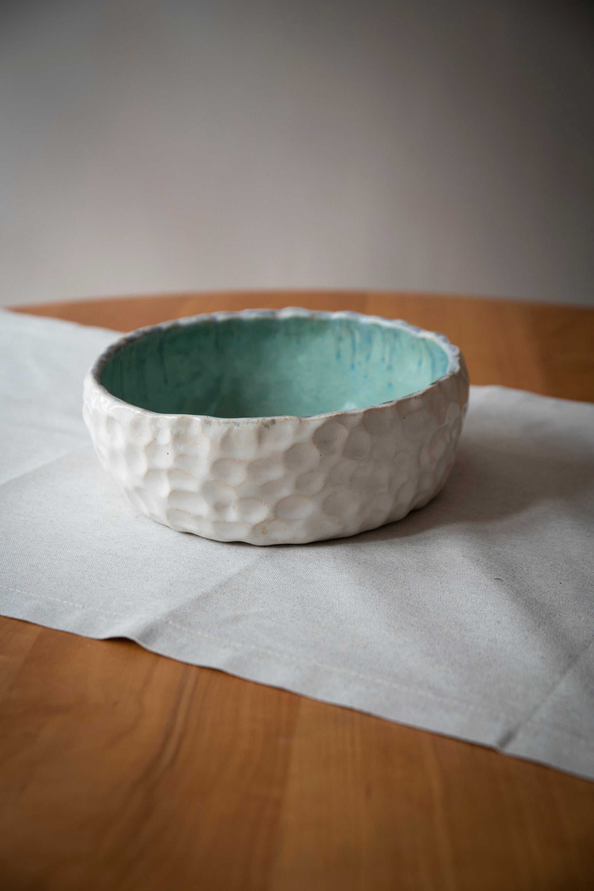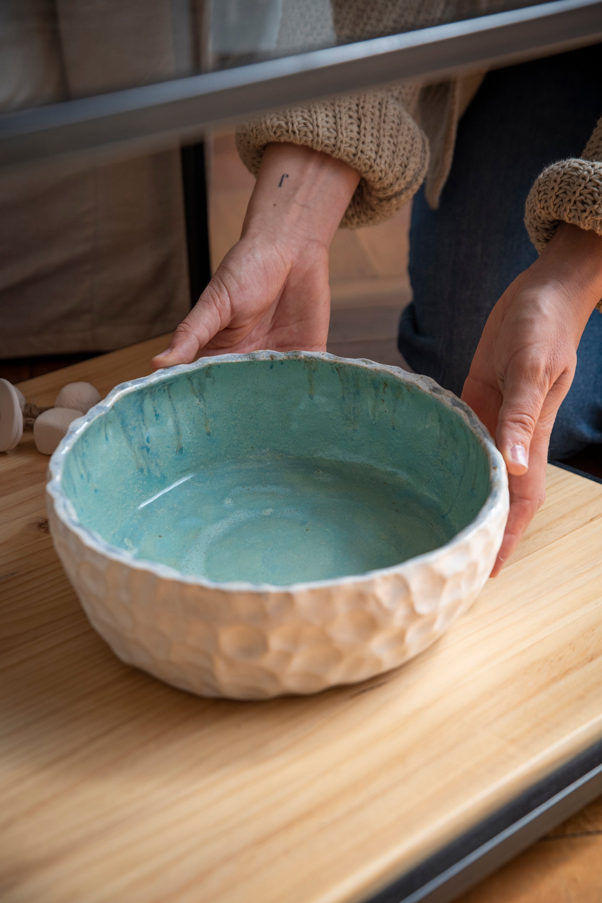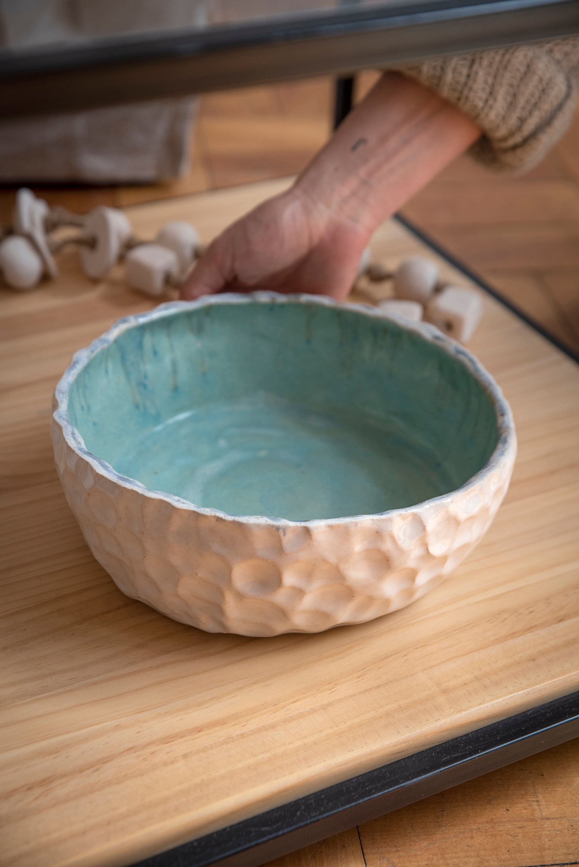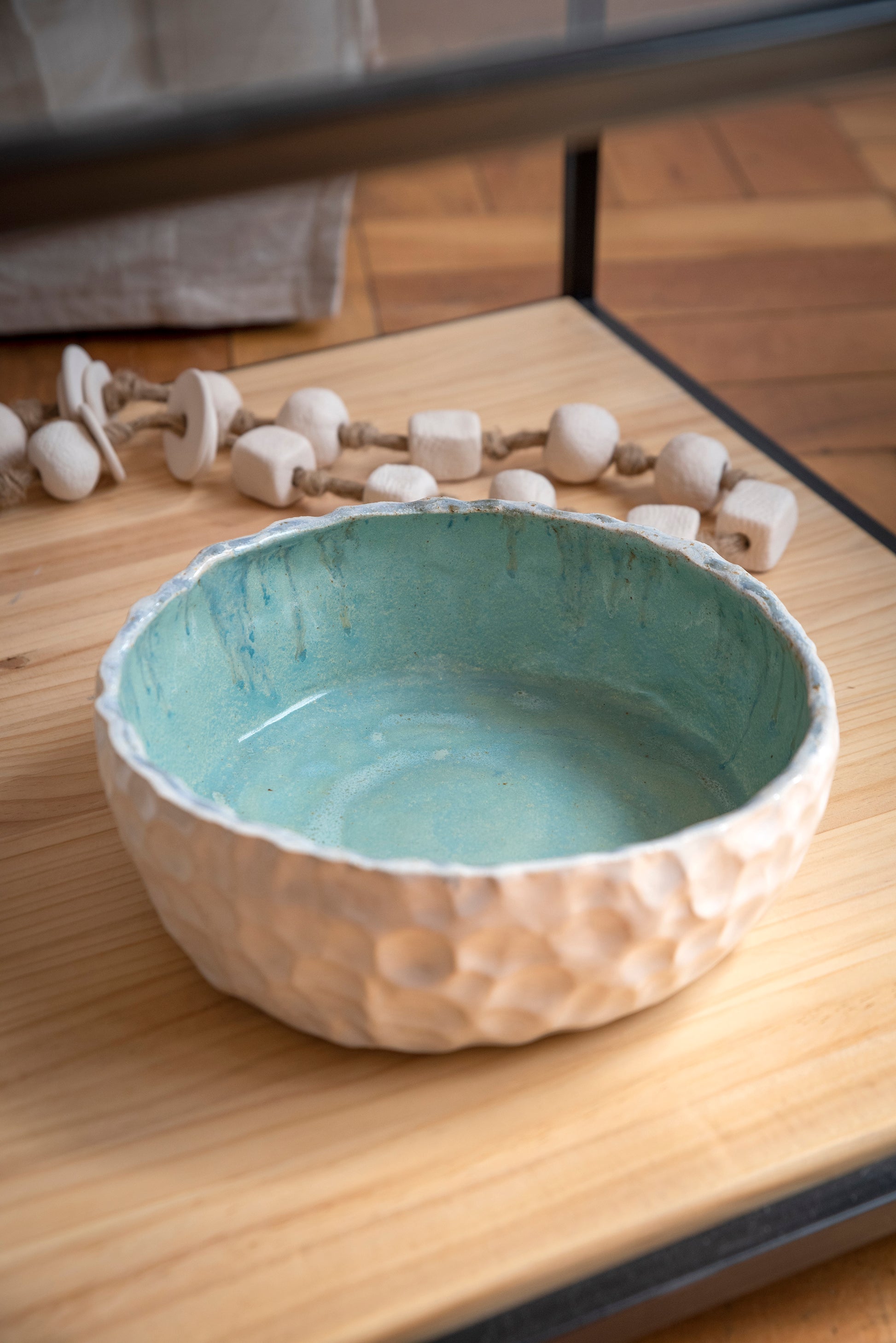 Cerámica de gres 100% hecha a mano, en un proceso artesanal en el que cada pieza es cuidadosamente modelada y elaborada por la artista. Cada pieza posee acabados distintos lo que le da la cualidad de ser única.