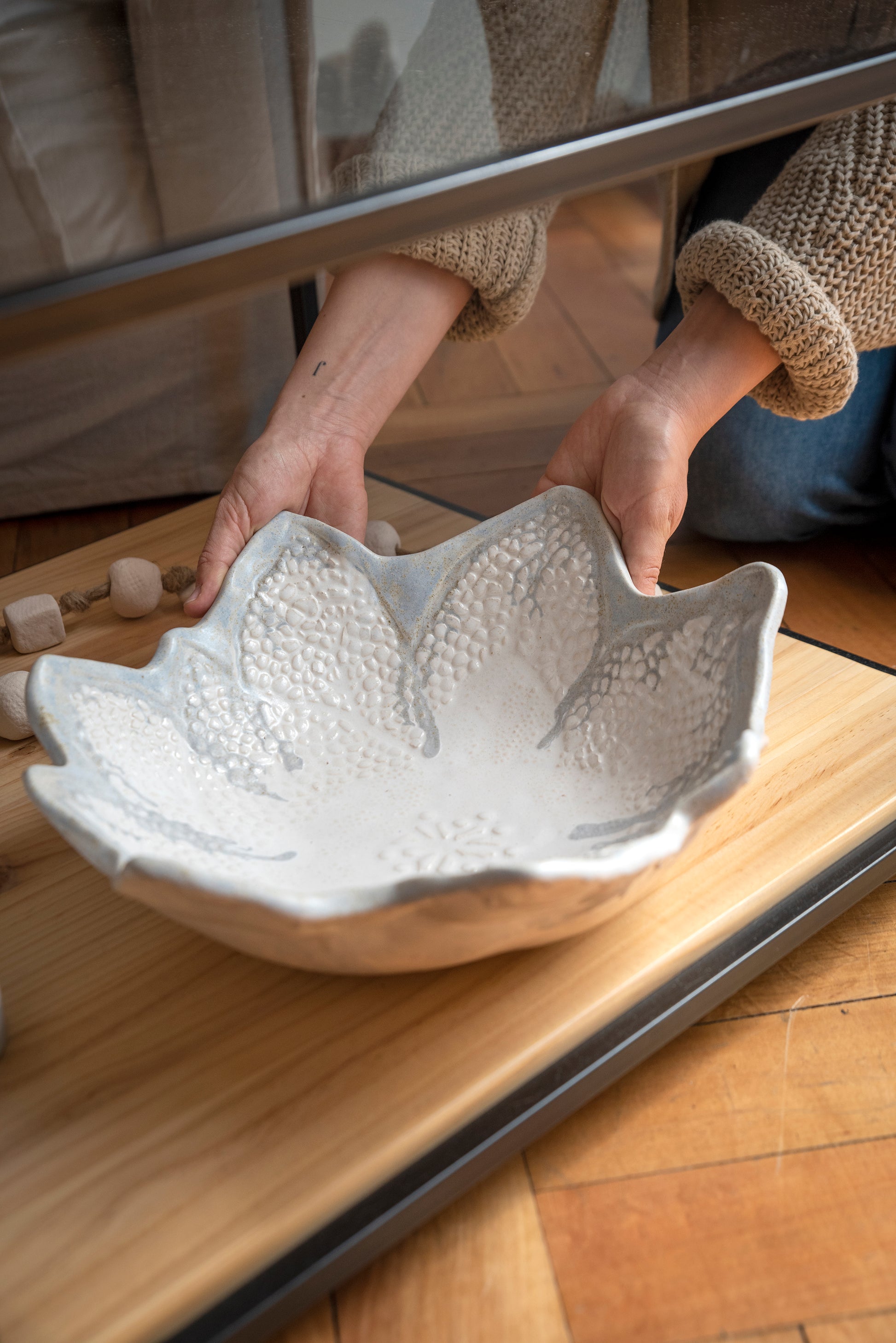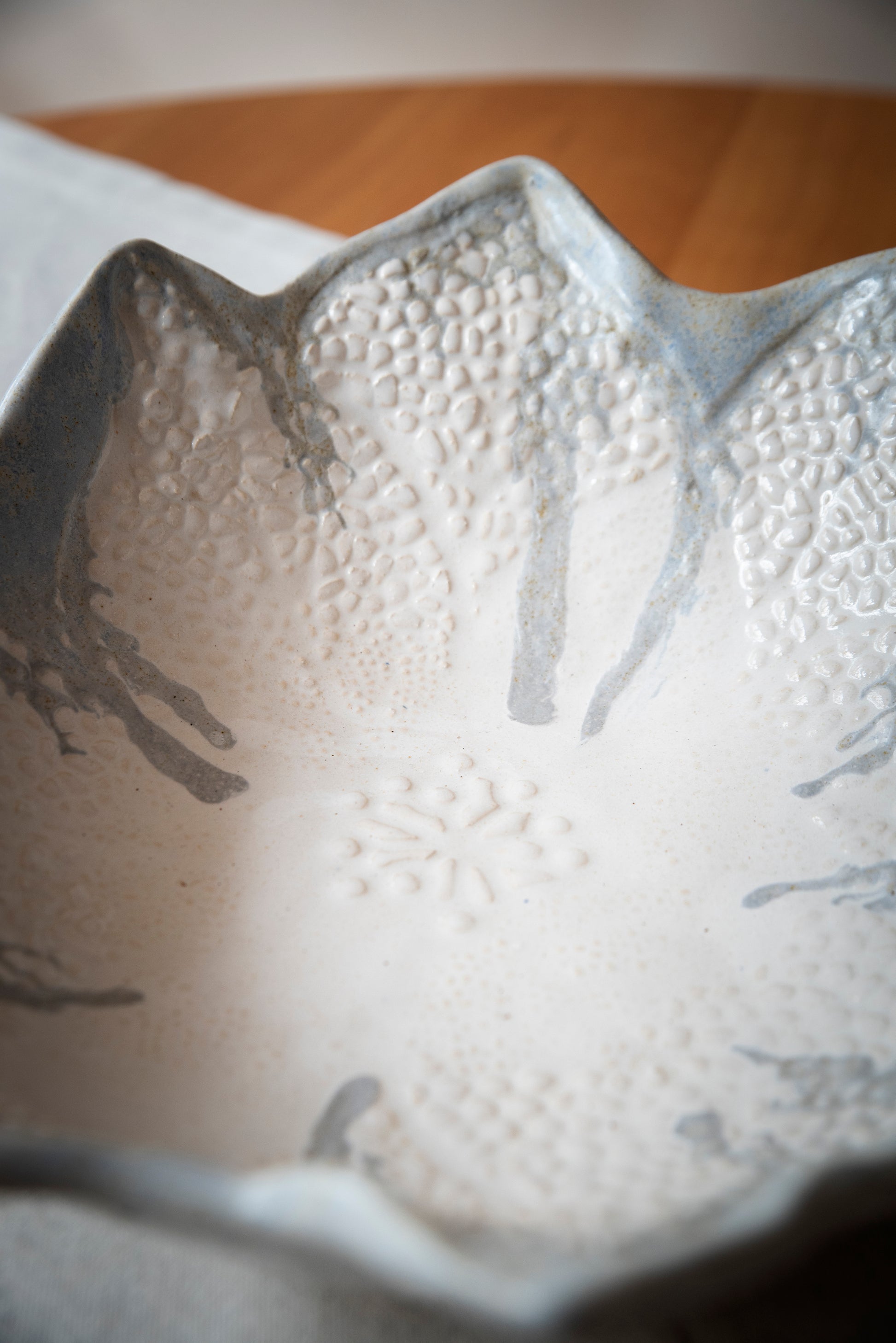 Cerámica de gres 100% hecha a mano, en un proceso artesanal en el que cada pieza es cuidadosamente modelada y elaborada por la artista. Cada pieza posee acabados distintos lo que le da la cualidad de ser única.