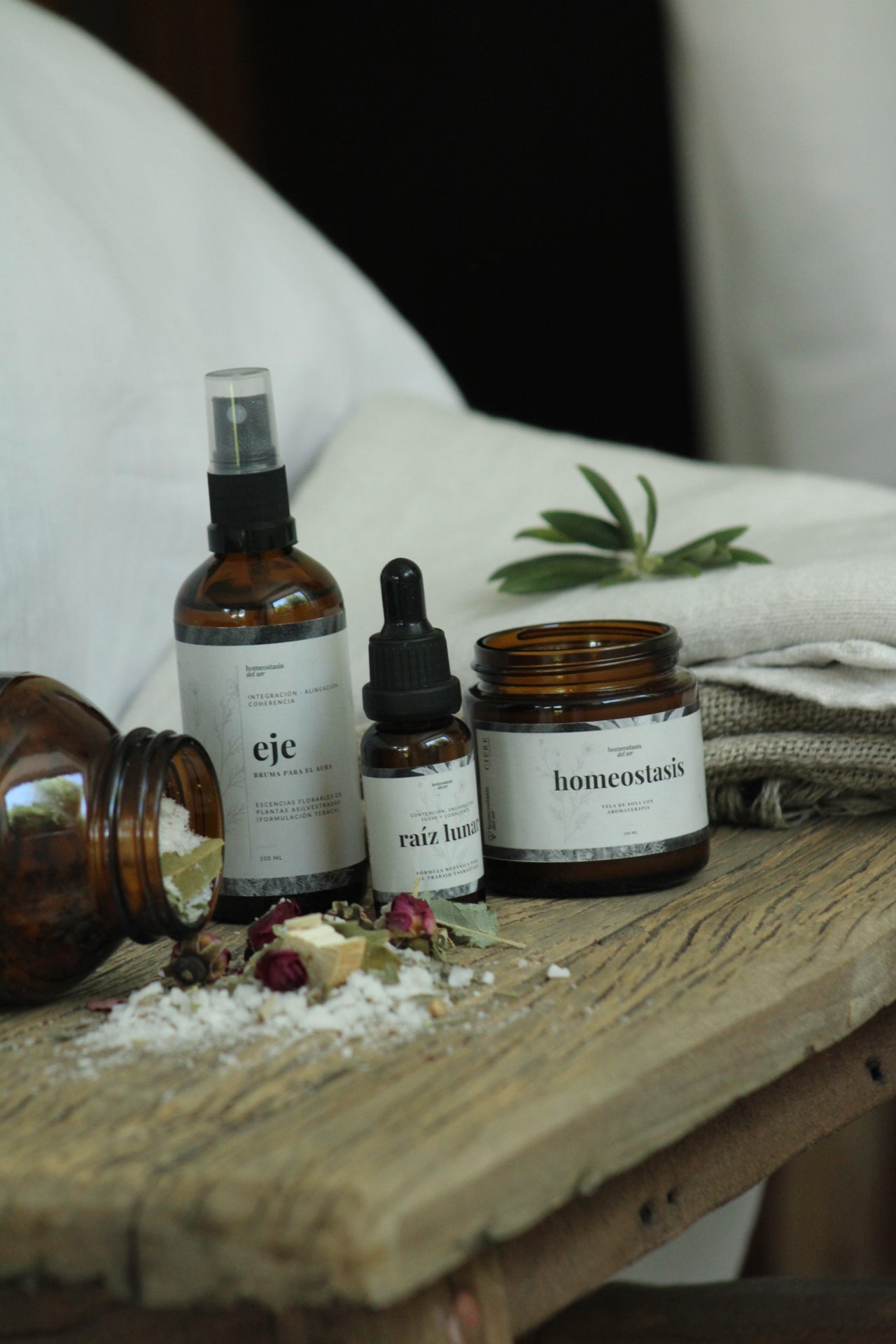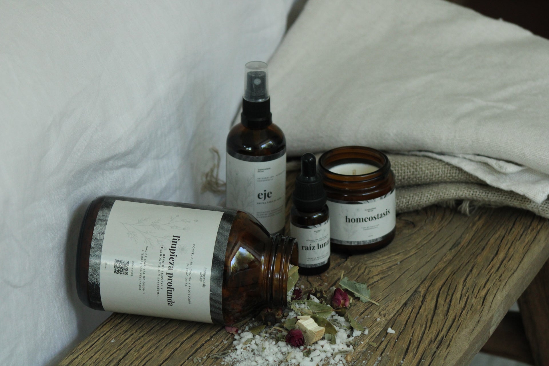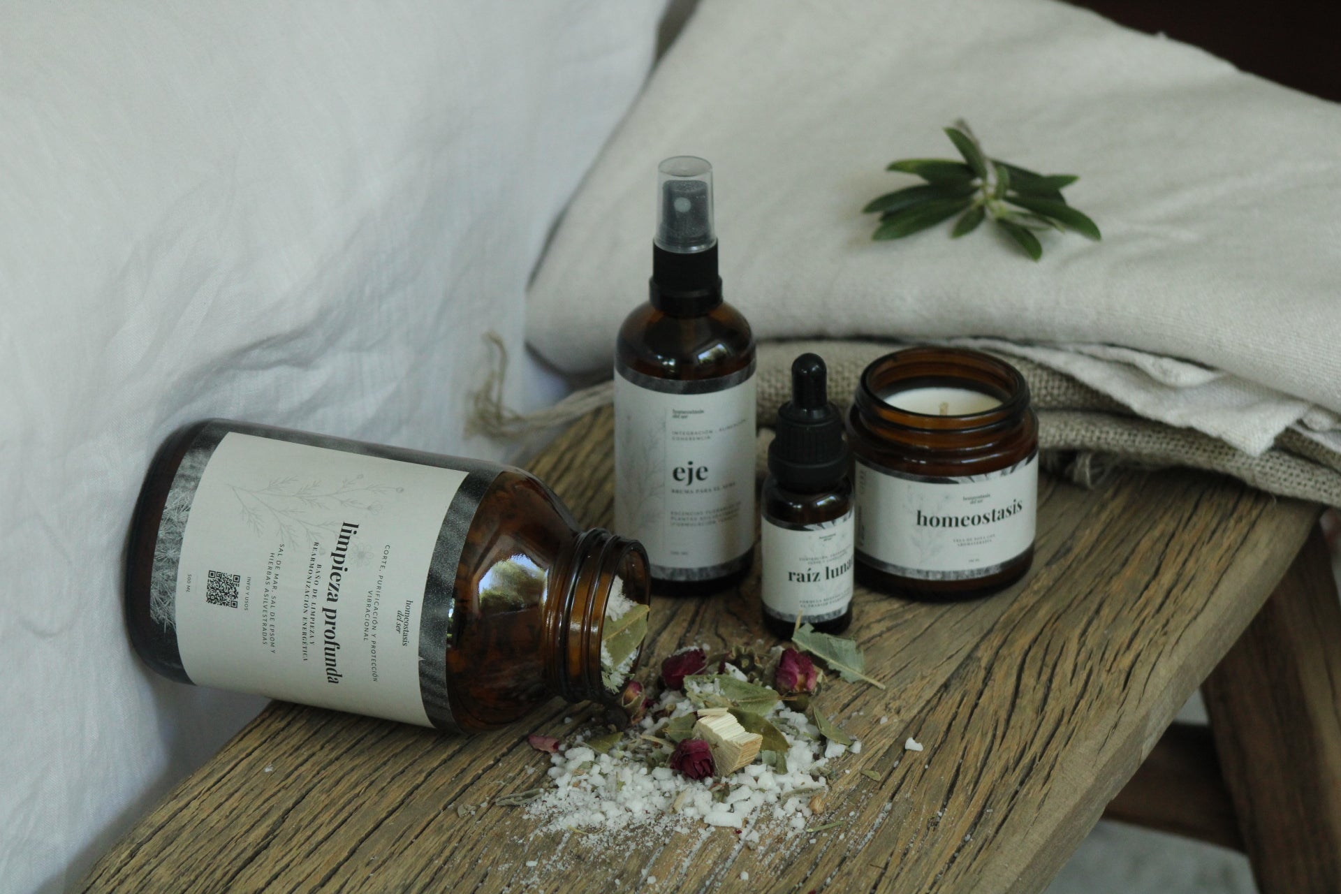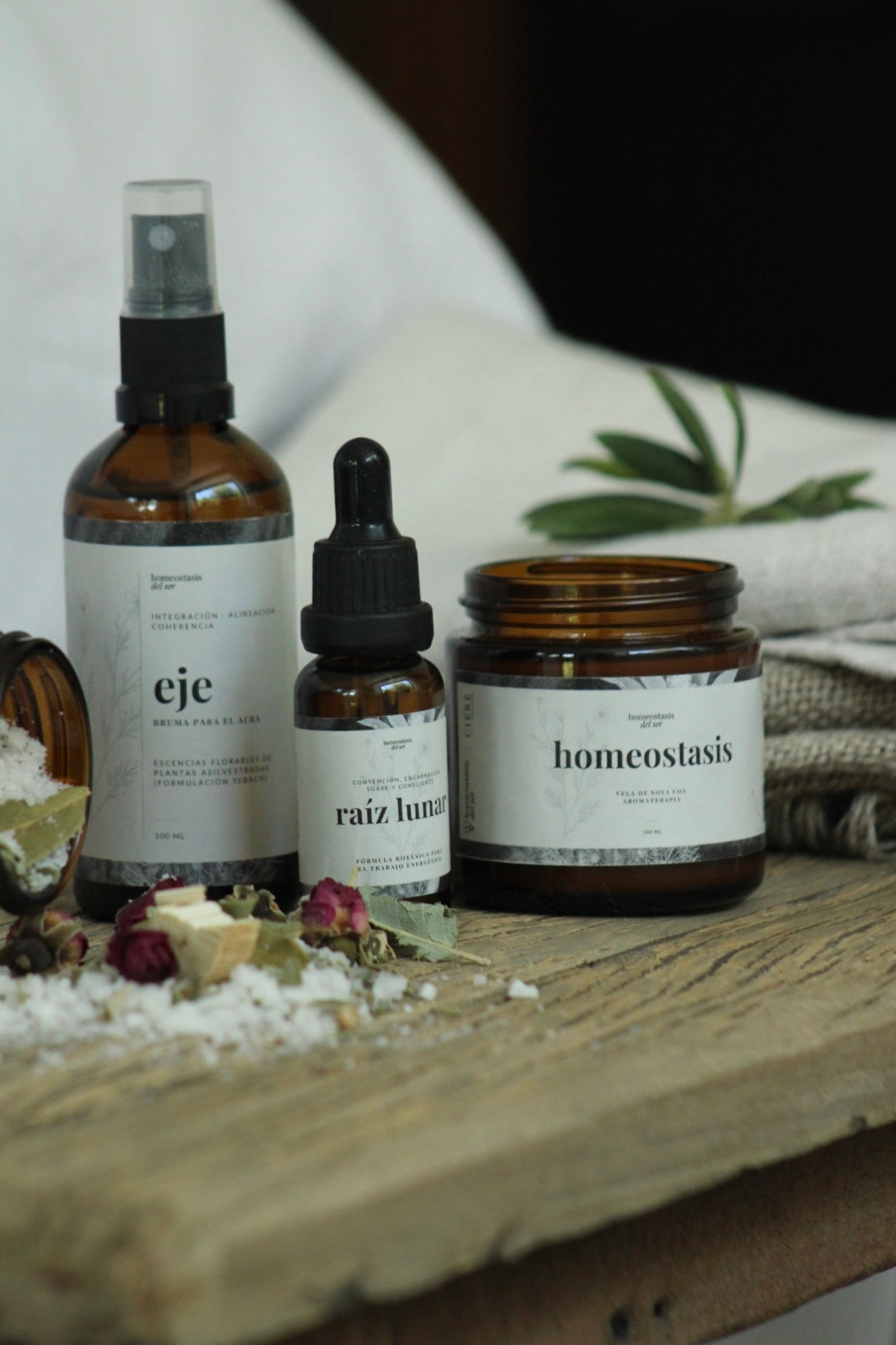 Esta caja reúne cuatro herramientas en sinergia: Baño Limpieza Profunda (descarga y alivio), Vela Homeostasis (marca el santuario), Aceite Raíz Lunar (contención y raíz segura) y Bruma Eje (realineación y centro).