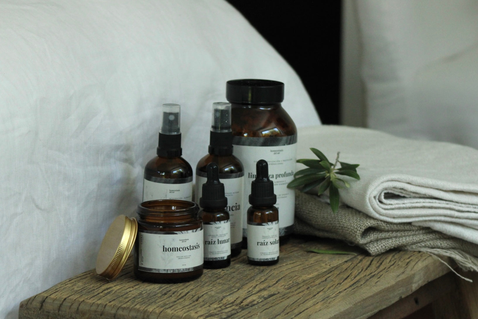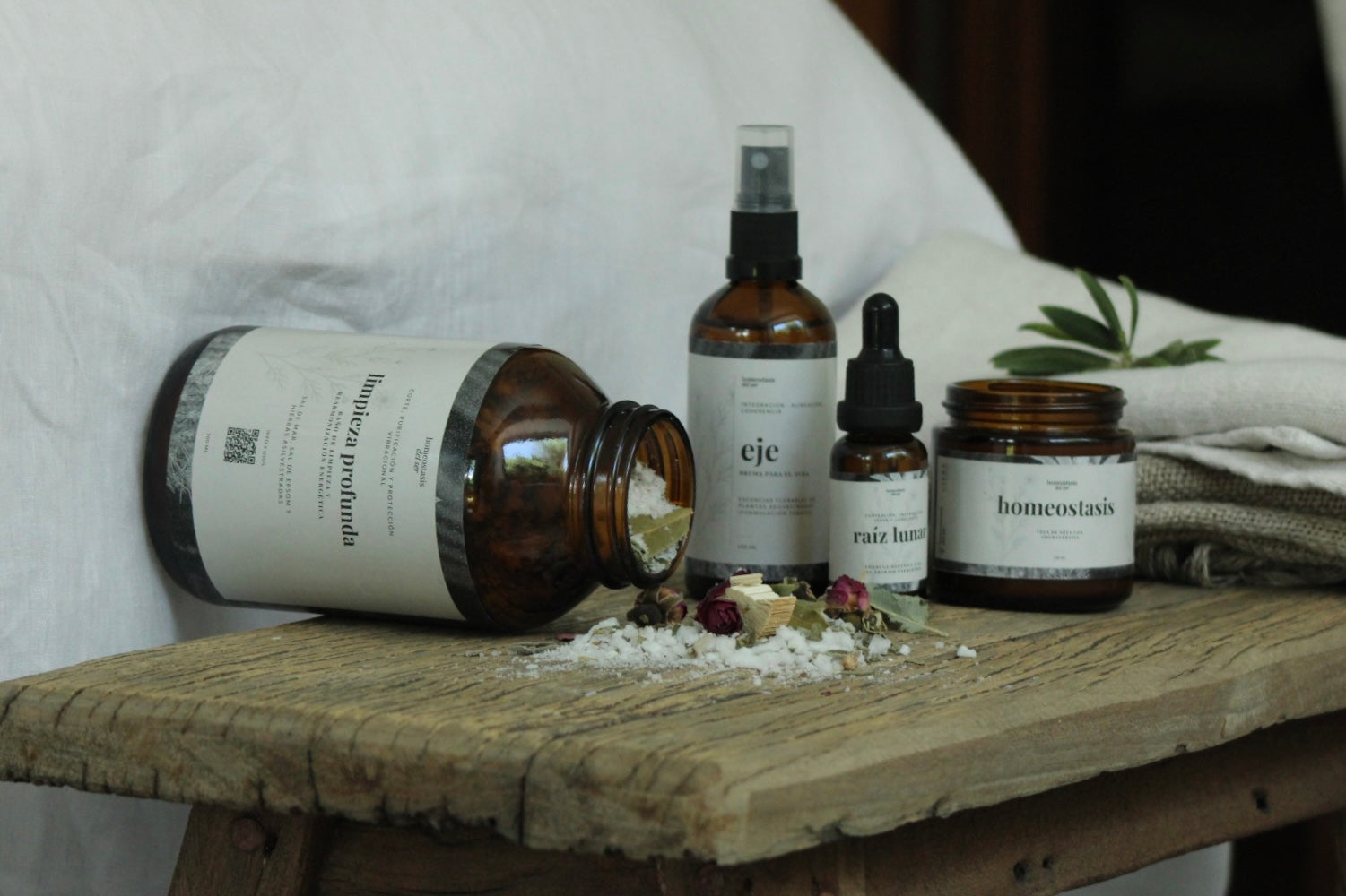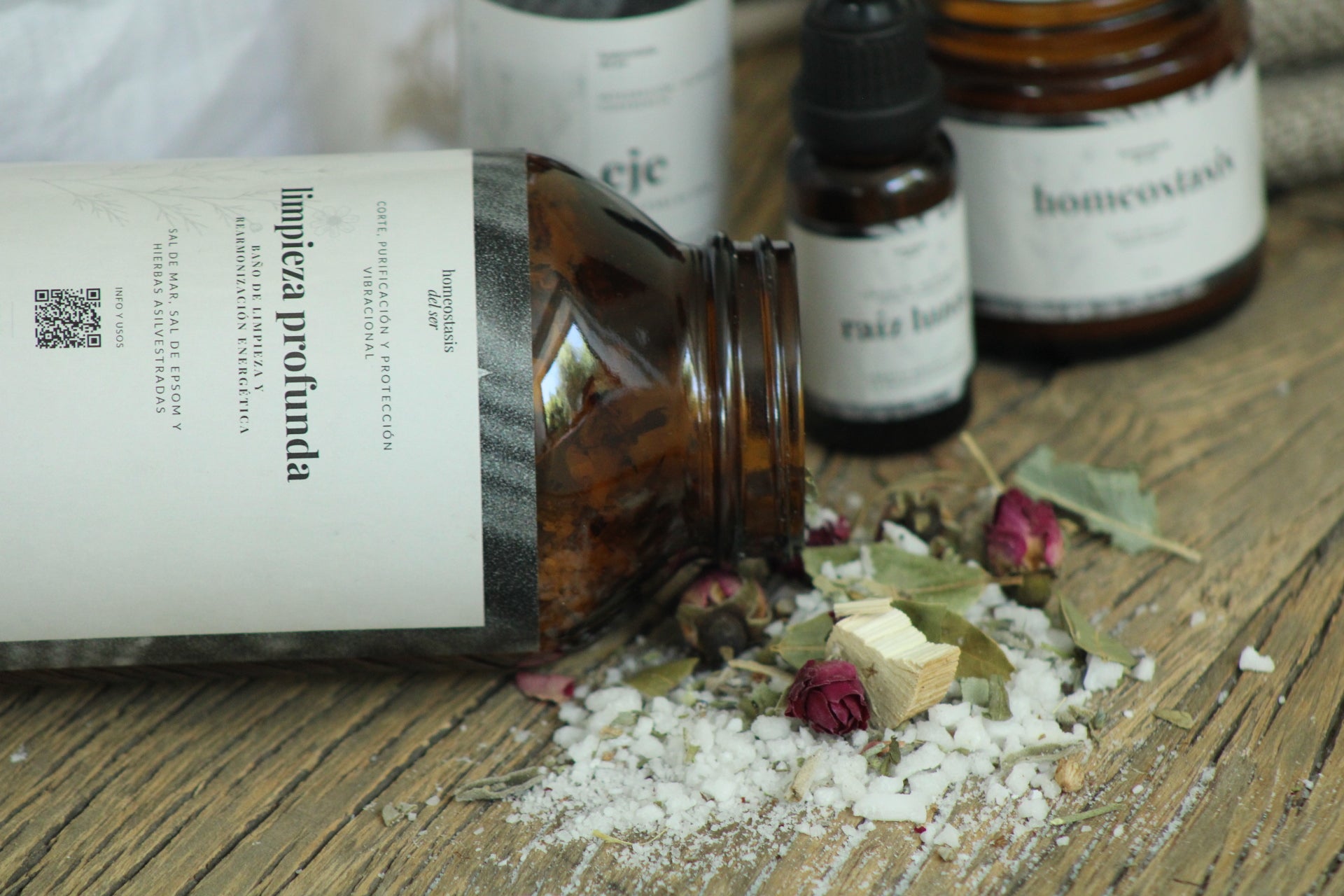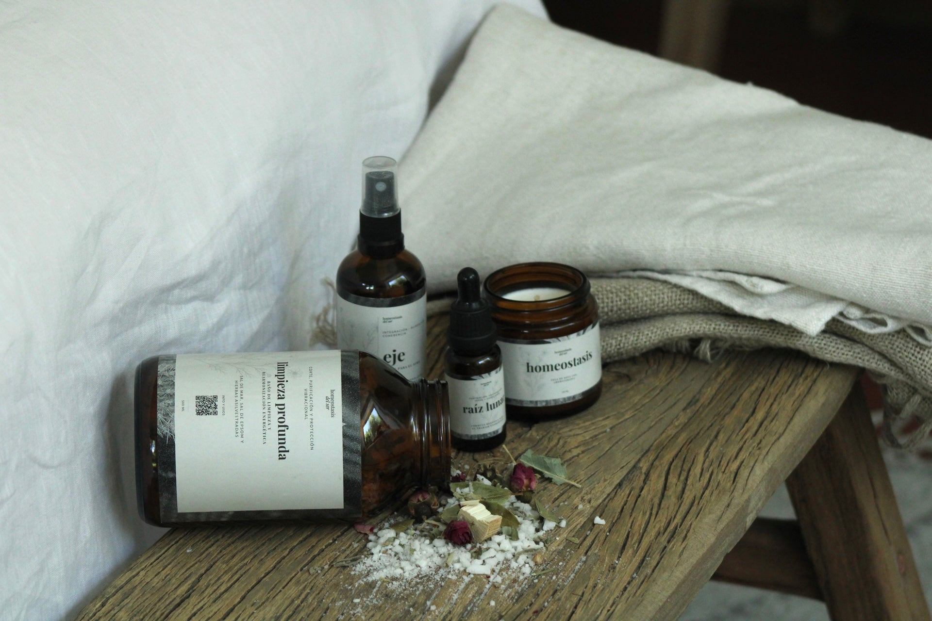Esta caja reúne cuatro herramientas en sinergia: Baño Limpieza Profunda (descarga y alivio), Vela Homeostasis (marca el santuario), Aceite Raíz Lunar (contención y raíz segura) y Bruma Eje (realineación y centro).