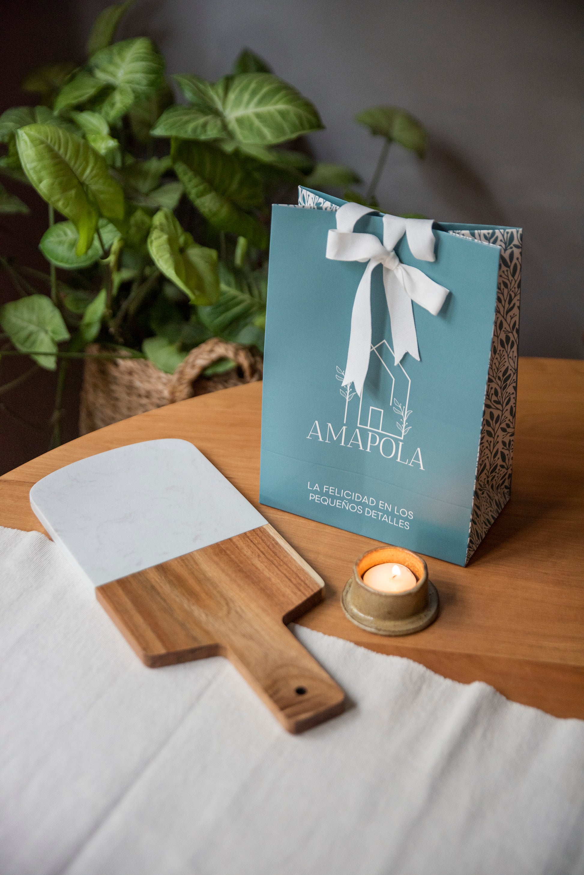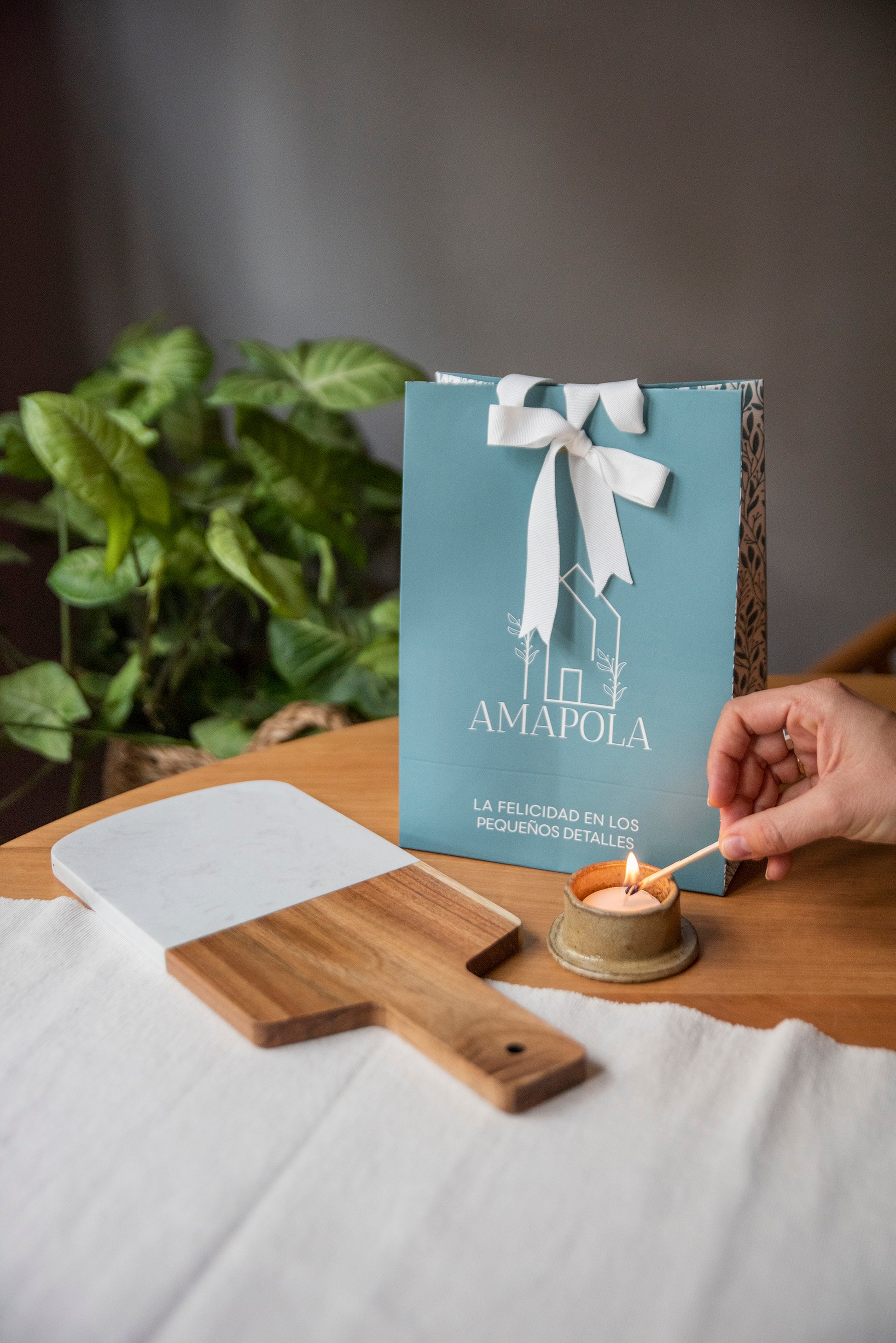 En este pack encontrarás una tabla de mármol y madera y un posta vela.