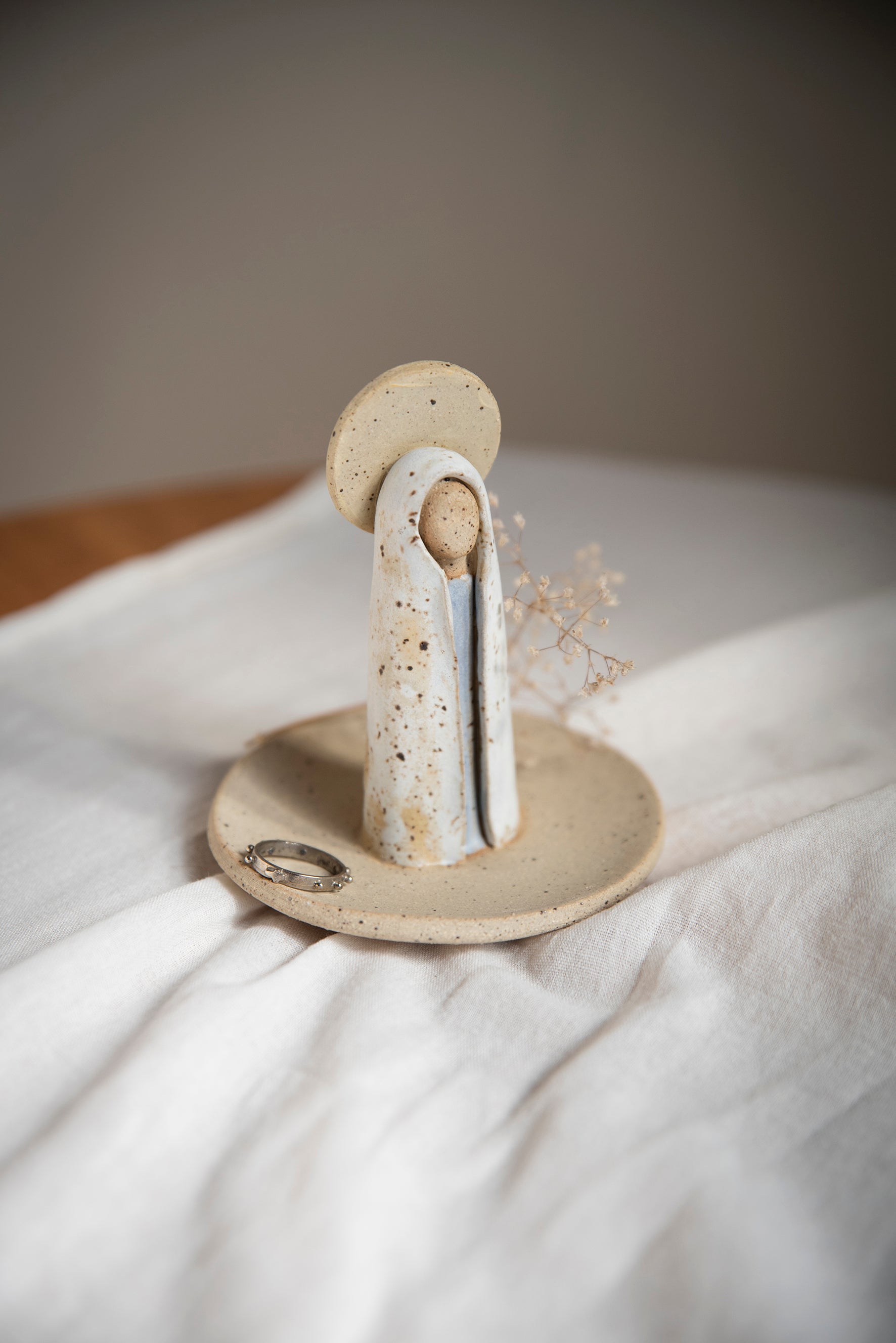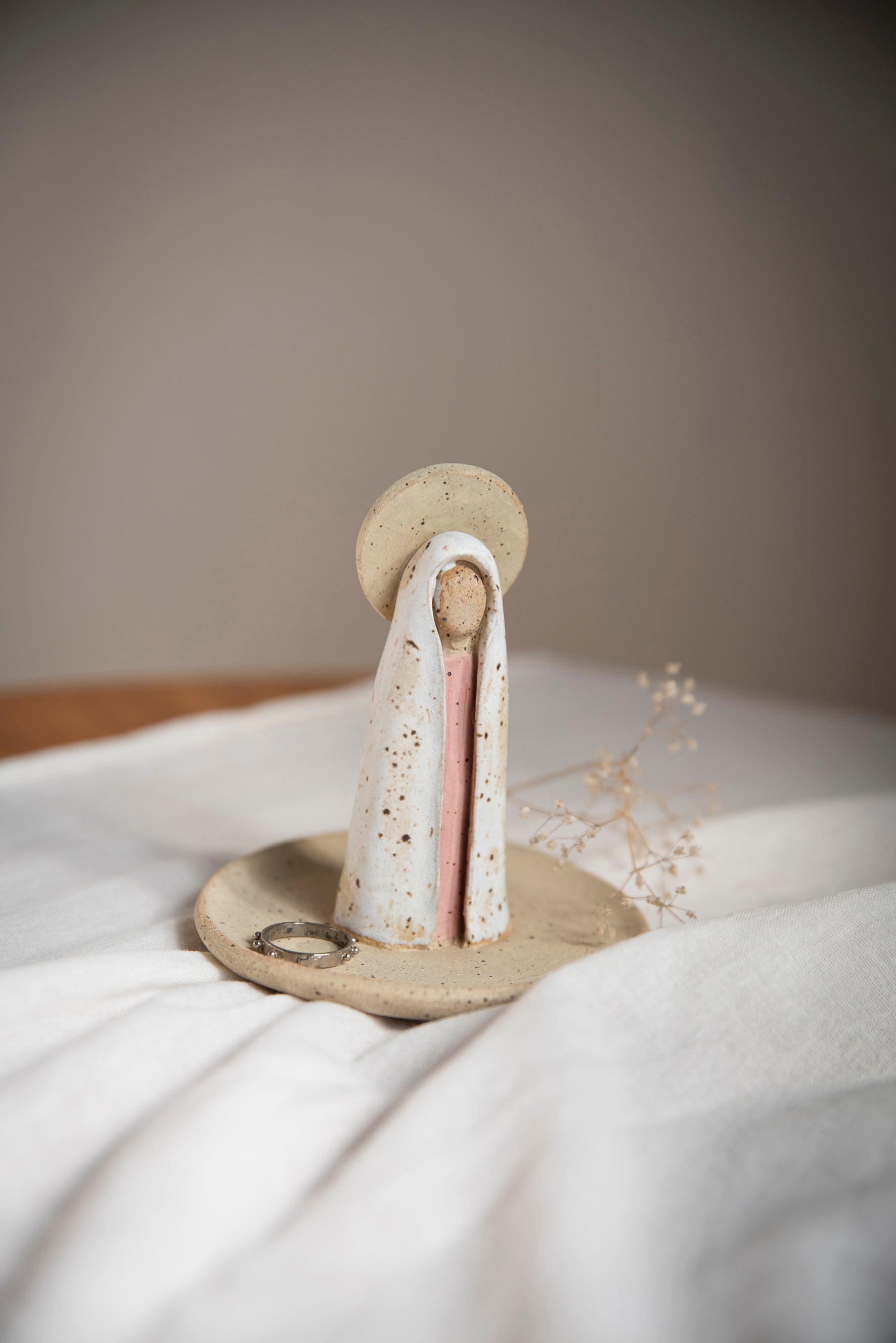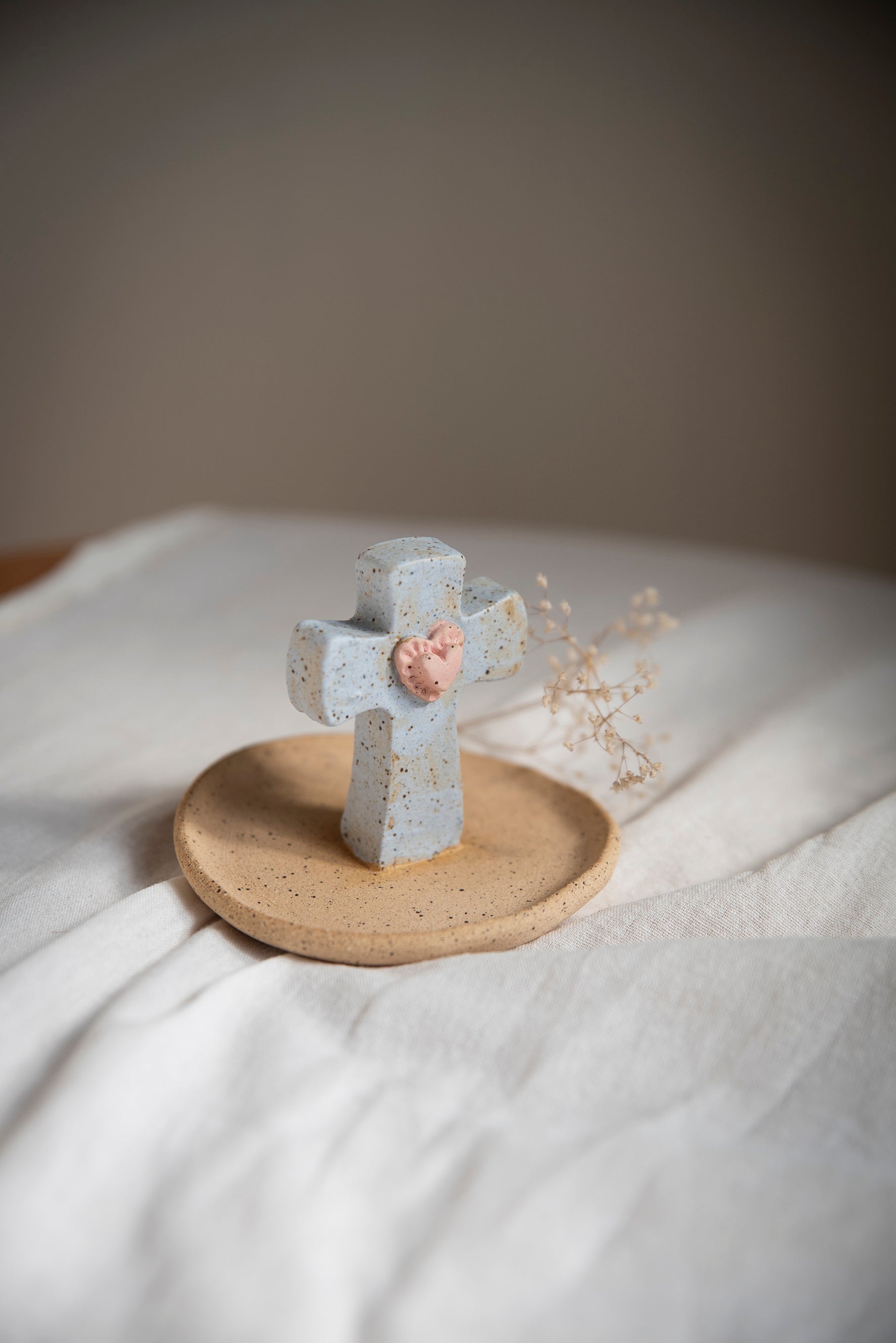 Plato ce cerámica gres con virgen o cruz al centro. Ideal para rosario o anillos.