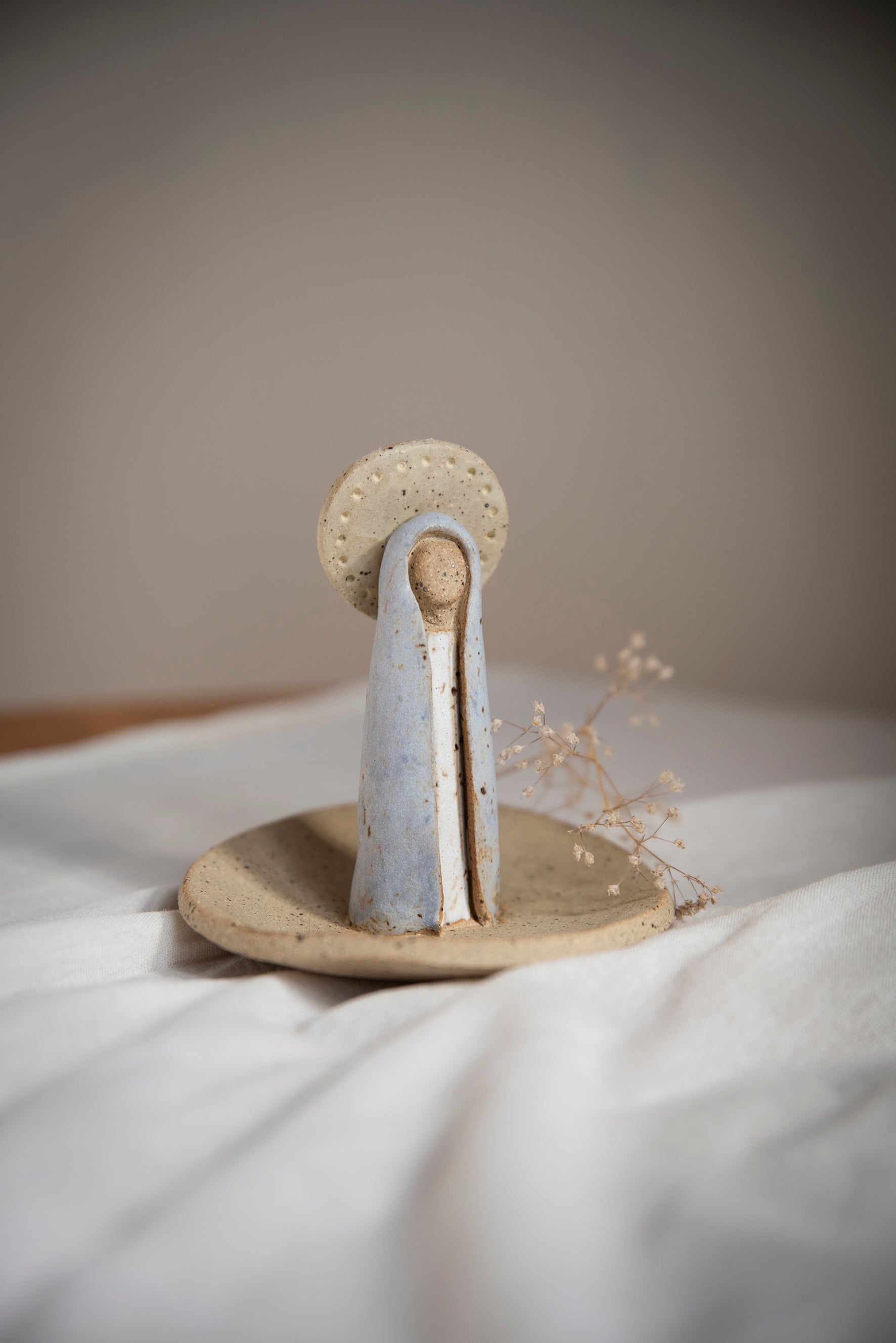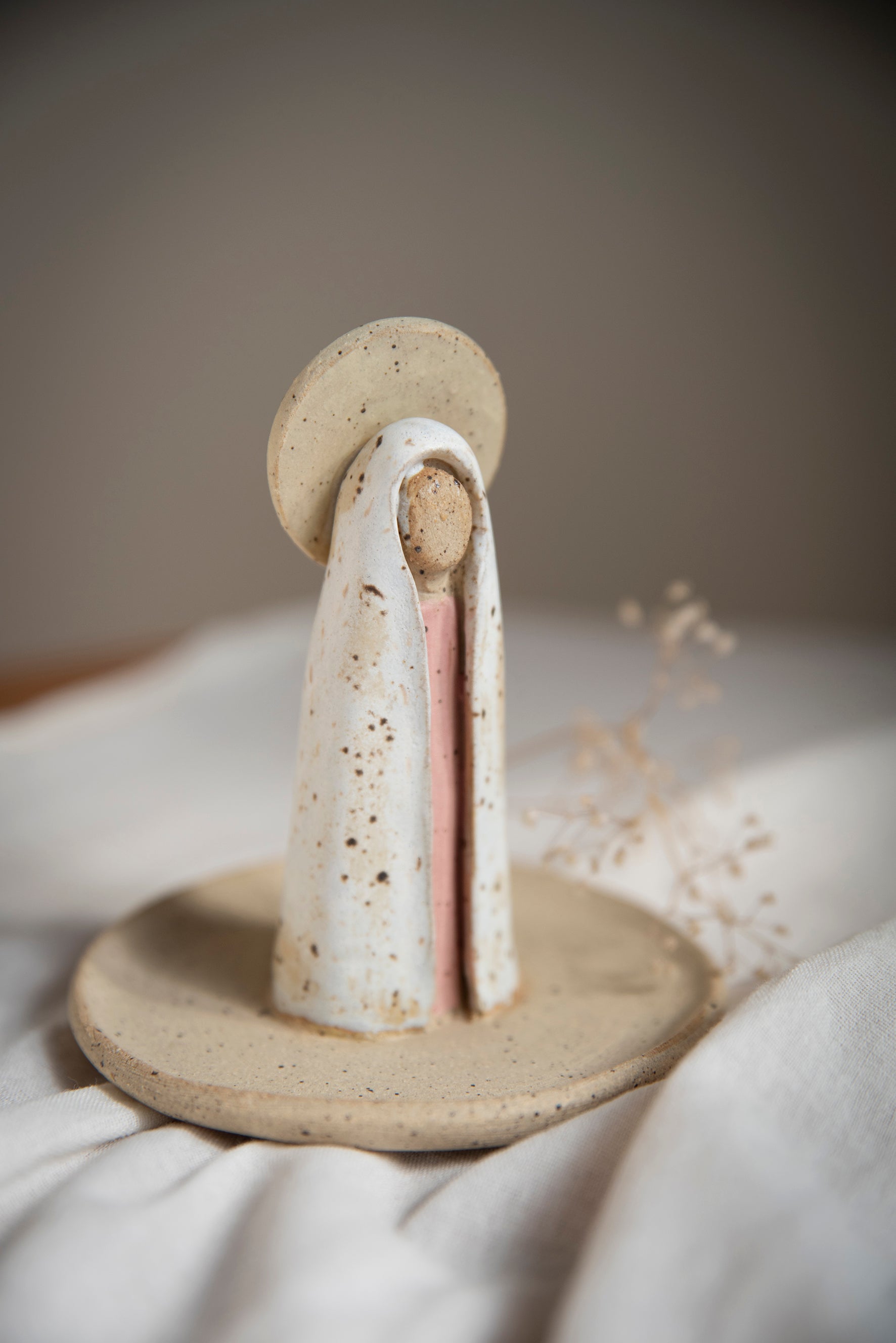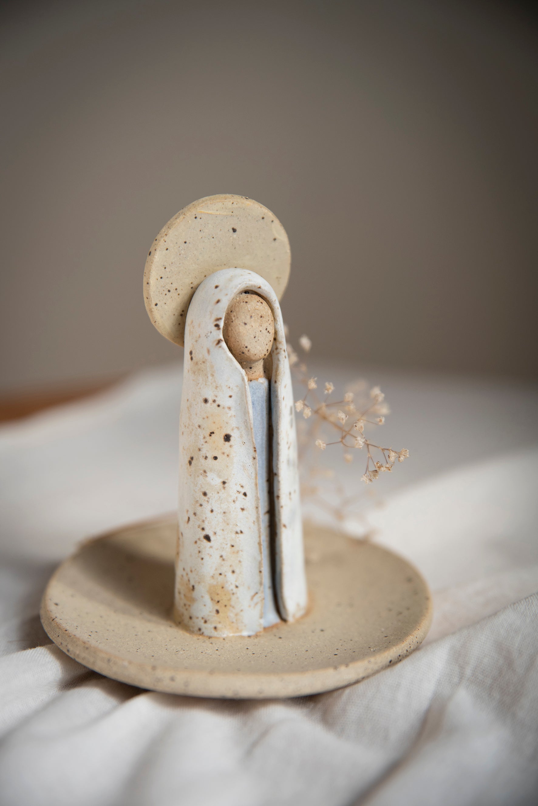 Plato ce cerámica gres con virgen o cruz al centro. Ideal para rosario o anillos.