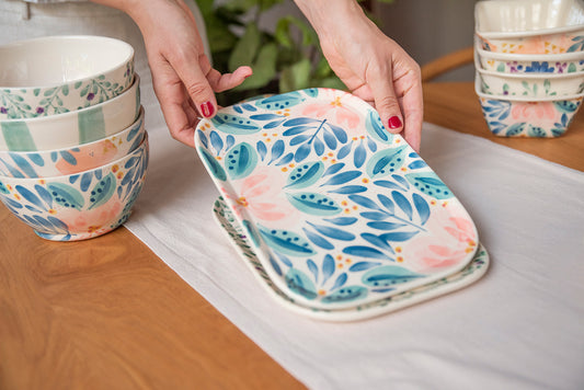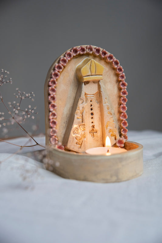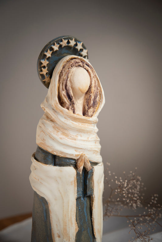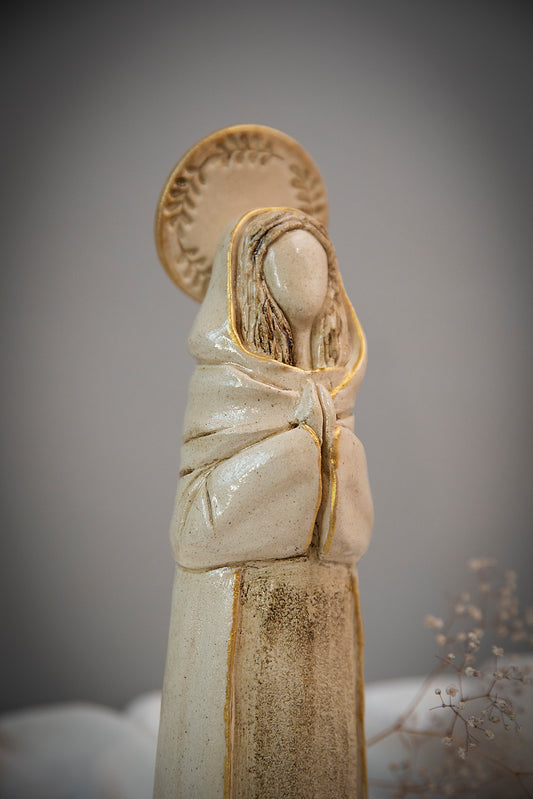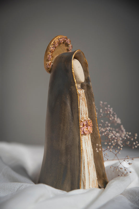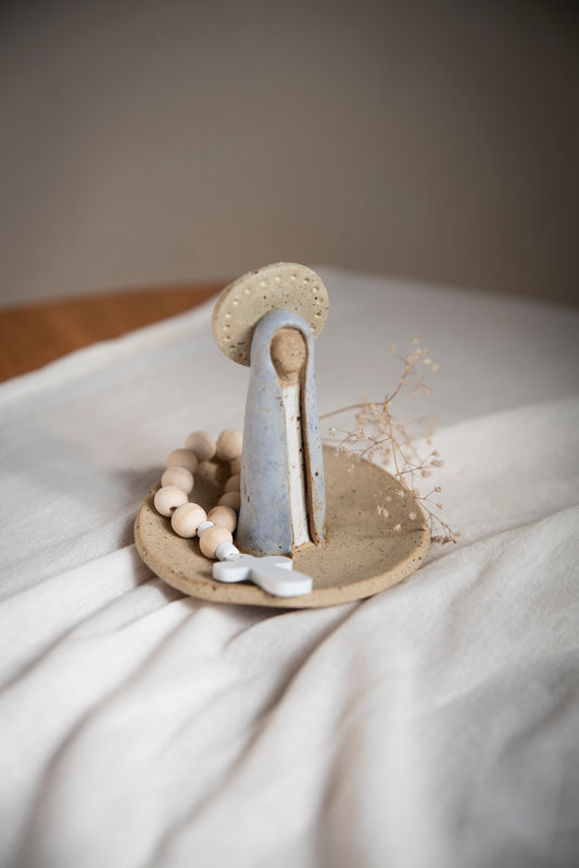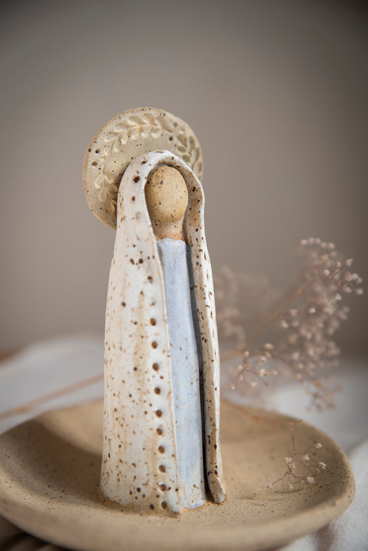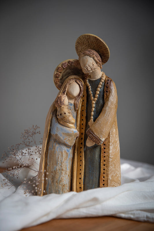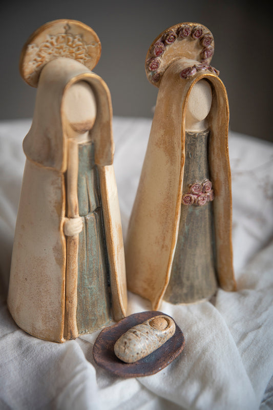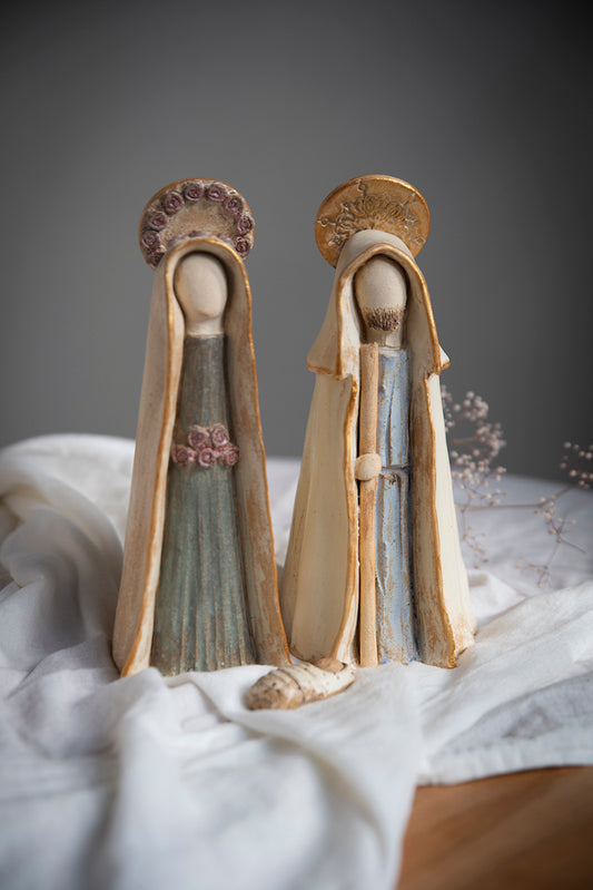Pesebre de cerámica María flores rosa y Jose túnica celeste